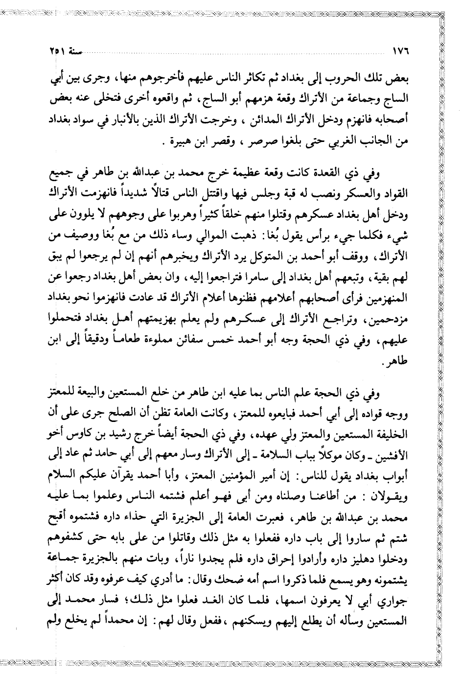 وفي ذي القعدة كانت وقعة عظيمة خرج محمد بن عبد الله بن طاهر في جميع القواد والعسكر ونصب له قبة وجلس فيها واقتتل الناس قتالا شديدا وانهزمت الأتراك ودخل أهل بغداد عسكرهم وقتلوا منهم خلقا كثيرا وهربوا على وجوههم لا يلوون على شيء فكلما جيء برأس يقول بغا ذهبت الموالي وساء ذلك من مع بغا ووصيف من الأتراك ووقف أبو أحمد بن المتوكل يرد الأتراك ويخبرهم أنهم إن لم يرجعوا لم يبق لهم بقية وتبعهم أهل بغداد إلى سامرا فتراجعوا إليه وإن بعض أهل بغداد رجعوا عن المنهزمين فرأى أصحابهم أعلامهم فظنوها أعلام الأتراك قد عادت فانهزموا نحو بغداد مزدحمين وتراجع الأتراك إلى عسكرهم ولم يعلم بهزيمتهم أهل بغداد فتحملوا عليهم وفي ذي الحجة وجه أبو أحمد خمس سفائن مملوءة طعاما ودقيقا إلى ابن طاهر