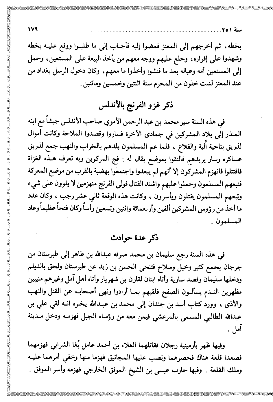 في هذه السنة سير محمد بن عبد الرحمن الأموي صاحب الأندلس جيشا مع ابنه المنذر إلى بلاد المشركين في جمادى الآخرة فساروا وقصدوا الملاحة وكانت أموال لذريق بناحية ألية والقلاع فلما عم المسلمون بلدهم بالخراب والنهب جمع لذريق عساكره وسار يريدهم فالتقوا بموضع يقال له فج المركوين وبه تعرف هذه الغزاة فاقتتلوا فانهزم المشركون إلا أنهم لم يبعدوا واجتمعوا بهضبة بالقرب من موضع المعركة فتبعهم المسلمون وحملوا عليهم واشتد القتال فولى الفرنج منهزمين لا يلوون على شيء وتبعهم المسلمون يقتلون ويأسرون وكانت هذه الوقعة ثاني عشر رجب وكان عدد ما أخذ من رؤوس المشركين ألفين وأربعمائة واثنين وتسعين رأسا وكان فتحا عظيما وعاد المسلمون