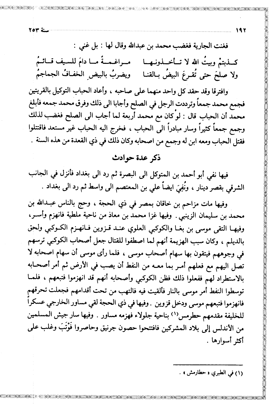 وفيها في ذي الحجة لقي مساور الخارجي عسكرا للخليفة مقدمهم حطرمس بناحية جلولاء فهزمه مساور