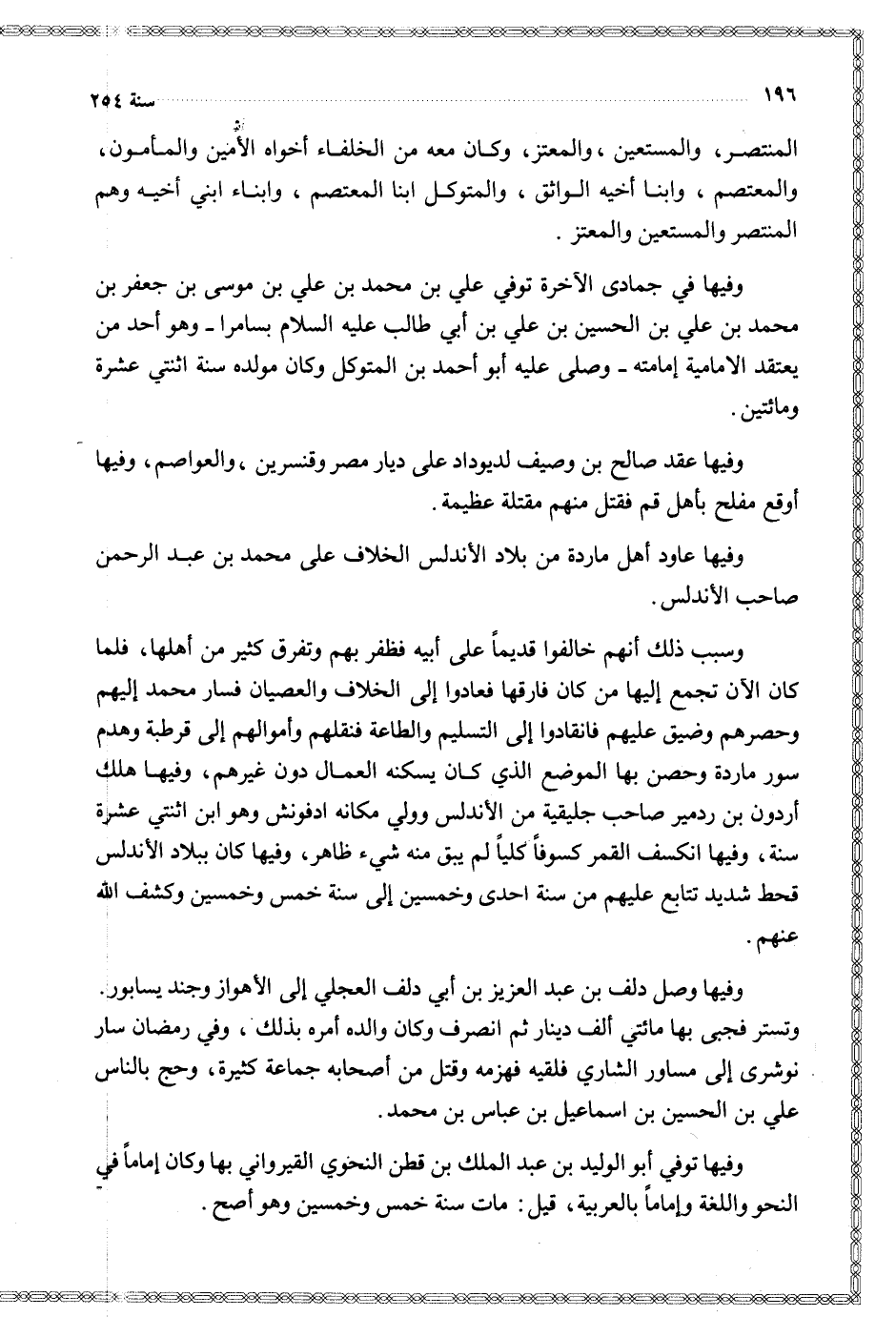 وفيها في جمادى الآخرة توفي علي بن محمد بن علي بن موسى بن جعفر بن محمد بن علي بن الحسين بن علي بن أبي طالب عليه السلام بسامرا وهو أحد من يعتقد الأمامية إمامته وصلى عليه أبو أحمد بن المتوكل وكان مولده سنة اثنتي عشرة ومائتين