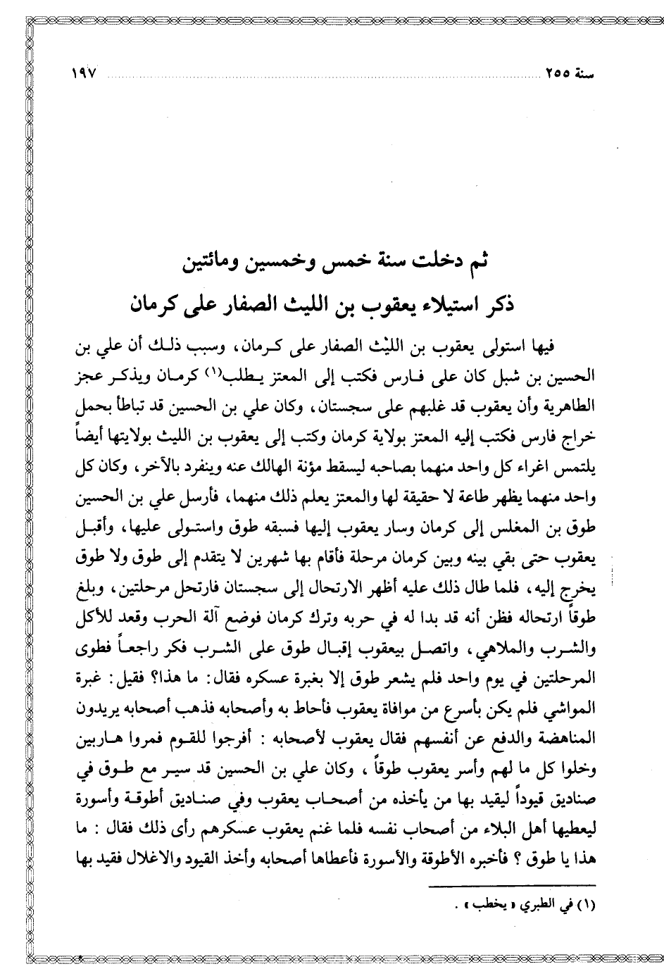 فيها استولى يعقوب بن الليث الصفار على كرمان وسبب ذلك أن علي بن الحسين بن شبل كان على فارس فكتب إلى المعتز يطلب كرمان ويذكر عجز الطاهرية وأن يعقوب قد غلبهم على سجستان وكان علي بن الحسين قد تباطأ بحمل خراج فارس فكتب إليه المعتز بولاية كرمان وكتب إلى يعقوب بن الليث بولايتها أيضا يلتمس إغراء كل واحد منهما بصاحبه ليسقط مؤنة الهالك عنه وينفرد بالآخر وكان كل واحد منهما يظهر طاعة لا حقيقة لها والمعتز يعلم ذلك منهما فأرسل علي بن الحسين طو بن المغلس إلى كرمان وسار يعقوب إليها فسبقه طوق واستولى عليها وأقبل يعقوب حتى بقي بينه وبين كرمان مرحلة فأقام بها شهرين لا يتقدم إلى طوق ولا طوق يخرج إليه فلما طال ذلك عليه أظهر الارتحال إلى سجستان فارتحل مرحلتين وبلغ طوقا ارتحاله فظن أنه قد بدا له في حربه وترك كرمان فوضع آلة الحرب وقعد للأكل والشرب والملاهي واتصل بيعقوب إقبال طوق على الشرب فكر راجعا فطوى المرحلتين في يوم واحد فلم يشعر طوق إلا بغبرة عسكره فقال ما هذا فقيل غبرة المواشي فلم يكن بأسرع من موافاة يعقوب فأحاط به وأصحابه فذهب أصحابه يريدون المناهضة والدفع عن أنفسهم فقال يعقوب لأصحابه أفرجوا للقوم فمروا هاربين وخلوا كل ما لهم وأسر يعقوب طوقا وكان علي بن الحسين قد سير مع طوق في صناديق قيوادا ليقيد بها من يأخذه من أصحاب يعقوب وفي صناديق أطوقة وأسورة ليعطيها أهل البلاء من أصحاب نفسه فلما غنم يعقوب عسكرهم رأى ذلك فقال ما هذا يا طوق فأخبره الأطوقة والأسورة فأعطاها أصحابه وأخذ القيود والأغلال فقيد بها