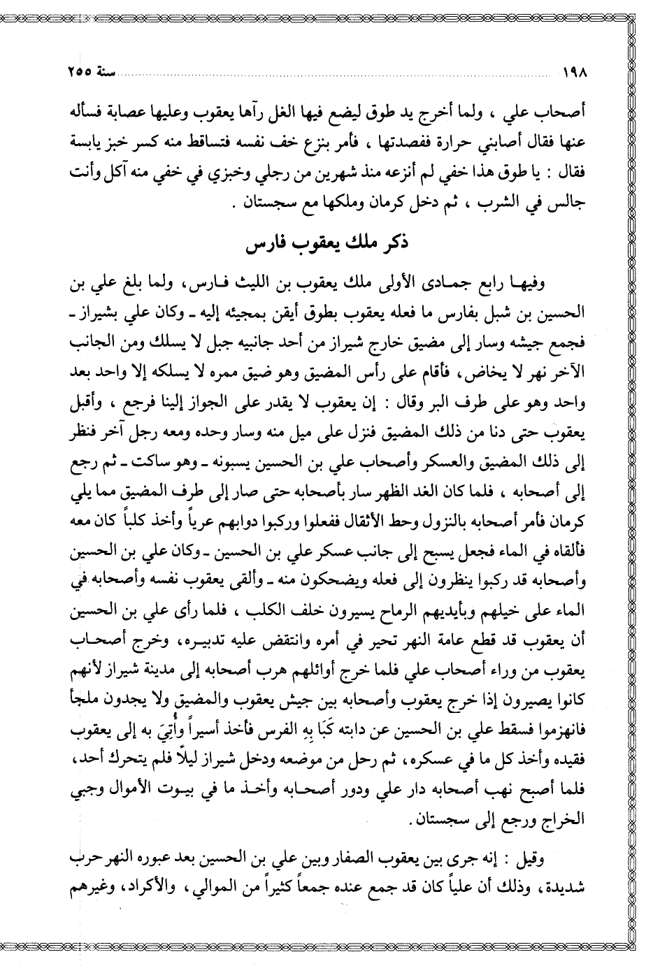 وفيها رابع جمادى الأولى ملك يعقوب بن الليث فارس ولما بلغ علي بن الحسين بن شبل بفارس ما فعله يعقوب بطوق أيقن بمجيئه إليه وكان علي بشيراز فجمع جيشه وسار إلى مضيق خارج شيراز من أحد جانبيه جبل لا يسلك ومن الجانب الاخر نهر لا يخاض فأقام على رأس المضيق وهو مضيق ممره لا يسلكه إلا واحد بعد واحد وهو على طرف البر وقال إن يعقوب لا يقدر على الجواز إلينا فرجع وأقبل يعقوب حتى دنا من ذلك المضيق فنزل على ميل منه وسار وحده ومعه رجل آخر فنظر إلى ذلك المضيق والعسكر وأصحاب علي بن الحسين يسبونه وهو ساكت ثم رجع إلى أصحابه فلما كان الغد الظهر سار بأصحابه حتى صار إلى طرف المضيق مما يلي كرمان فأمر أصحابه بالنزول وحط الأثقال ففعلوا وركبوا دوابهم عريا وأخذ كلبا كان معه فألقاه في الماء فجعل يسبح إلى جانب عسكر علي بن الحسين وكان علي بن الحسين وأصحابه قد ركبوا ينظرون إلى فعله ويضحكون منه وألقى يعقوب نفسه وأصحابه في الماء على خيلهم وبأيديهم الرماح يسيرون خلف الكلب فلما رأى علي بن الحسين أن يعقوب قد قطع عامة النهر تحير في أمره وانتقض عليه تدبيره وخرج أصحاب يعقوب من وراء أصحاب علي فلما خرج أوائلهم هرب أصحابه إلى مدينة شيراز لأنهم كانوا يصيرون إذا خرج يعقوب وأصحابه بين جيش يعقوب والمضيق ولا يجدون ملجأ فانهزموا فسقط علي بن الحسين عن دابته كبا به الفرس فأخذ أسيرا وأتي به إلى يعقوب فقيده وأخذ كل ما في عسكره ثم رحل من موضعه ودخل شيراز ليلا فلم يتحرك أحد فلما أصبح نهب أصحابه دار علي ودور أصحابه وأخذ ما في بيوت الأموال وجبي الخراج ورجع إلى سجستان