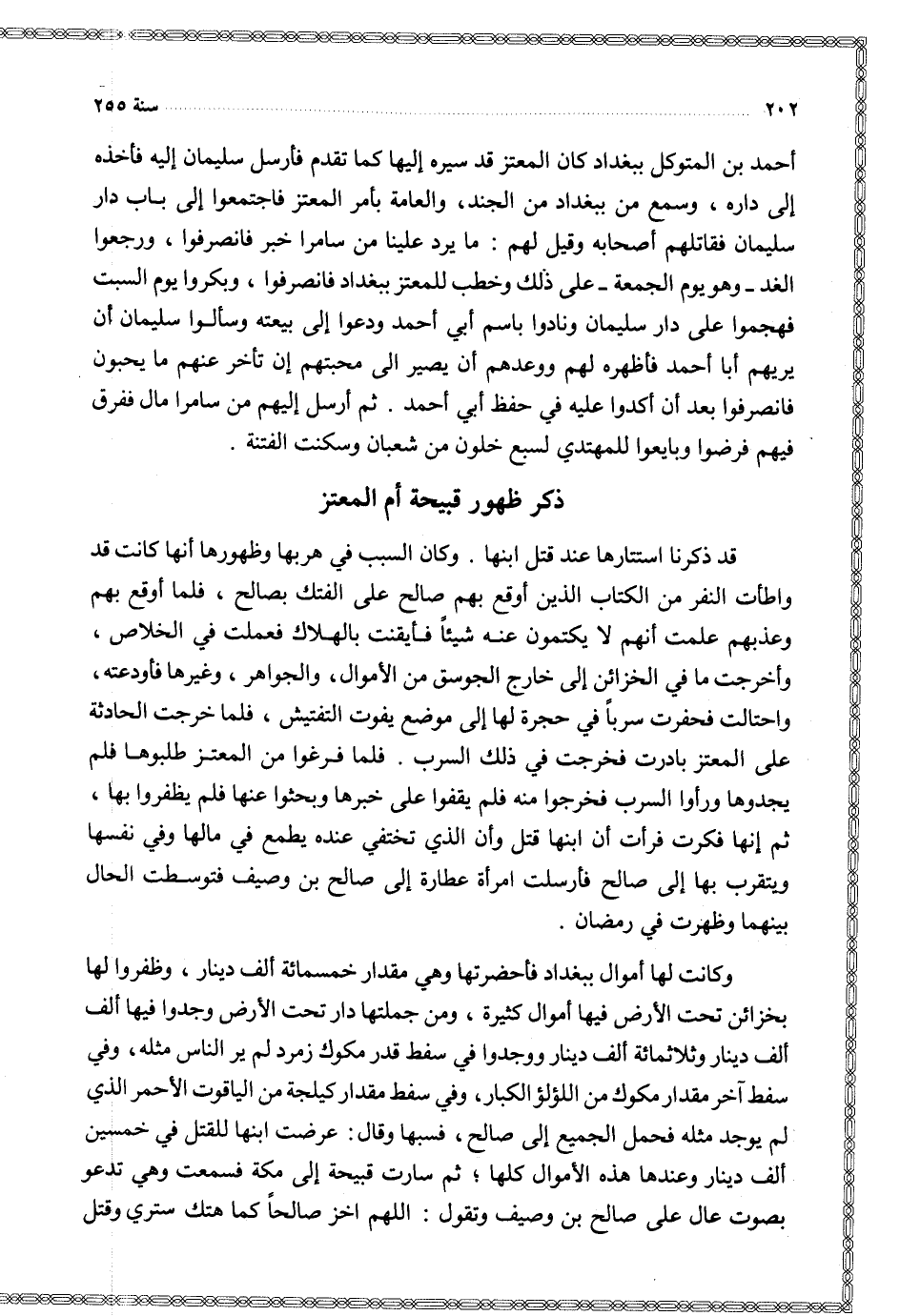أحمد بن المتوكل ببغداد كان المعتز قد سيره إليها كما تقدم فأرسل سليمان إليه فأخذه إلى داره وسمع من ببغداد من الجند والعامة بأمر المعتز فاجتمعوا إلى باب دار سليمان فقاتلهم أصحابه وقيل لهم ما يرد علينا من سامرا خبر فانصرفوا ورجعوا الغد وهو يوم الجمعة على ذلك وخطب للمعتز ببغداد فانصرفوا وبكروا يوم السبت فهجموا على دار سليمان ونادوا باسم أبي أحمد ودعوا إلى بيعته وسألوا سليمان أن يريهم أبا أحمد فأظهره لهم ووعدهم أن يصير إلى محبتهم إن تأخر عنهم ما يحبون فانصرفوا بعد أن أكدوا عليه في حفظ أبي أحمد