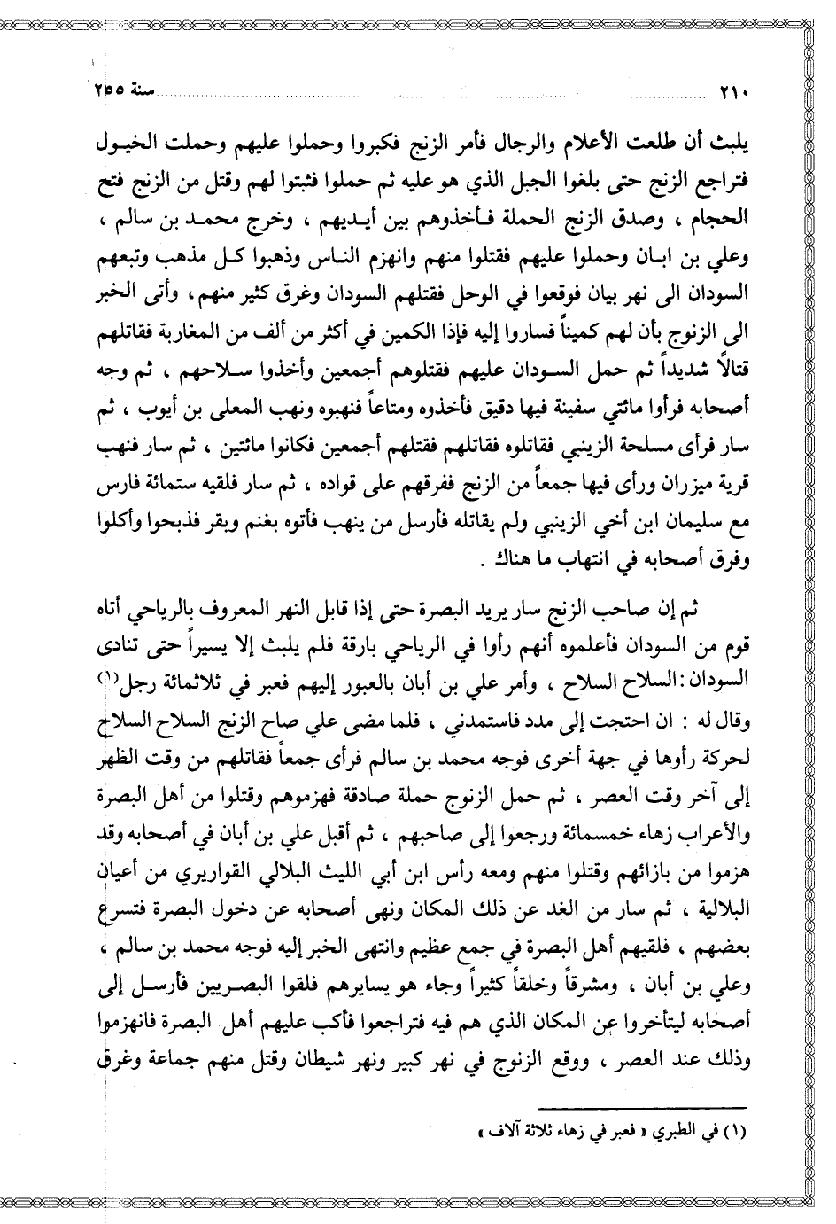 يلبث أن طلعت الأعلام والرجال فأمر الزنج فكبروا وحملوا عليهم وحملت الخيول فتراجع الزنج حتى بلغوا الجبل الذي هو عليه ثم حملوا فثبتوا لهم وقتل من الزنج فتح الحجام وصدق الزنج الحملة فأخذوهم بين أيديهم وخرج محمد بن سالم وعلي بن ابان وحملوا عليهم فقتلوا منهم وانهزم الناس وذهبوا كل مذهب وتبعهم السودان إلى نهر بيان فوقعوا في الوحل فقتلهم السودان وغرق كثير منهم وأتى الخبر إلى الزنوج بأن لهم كمينا فساروا إليه فإذا الكمين في أكثر من ألف من المغاربة فقاتلهم قتالا شديدا ثم حمل السودان عليهم فقتلوهم أجمعين وأخذوا سلاحهم ثم وجه أصحابه فرأوا مائتي سفينة فيها دقيق فأخذوه ومتاعا فنهبوه ونهب المعلى بن أيوب ثم سار فرأى مسلحة الزينبي فقاتلوا فقتلهم أجمعين فكانوا مائتين ثم سار فنهب قرية ميزران ورأى فيها جمعا من الزنج ففرقهم على قواده ثم سار فلقيه ستمائة فارس مع سليمان ابن أخي الزينبي ولم يقاتله فأرسل من بنهب فأتوه بغنم وبقر فذبحوا وأكلوا وفرق أصحابه في انتهاب ما هناك