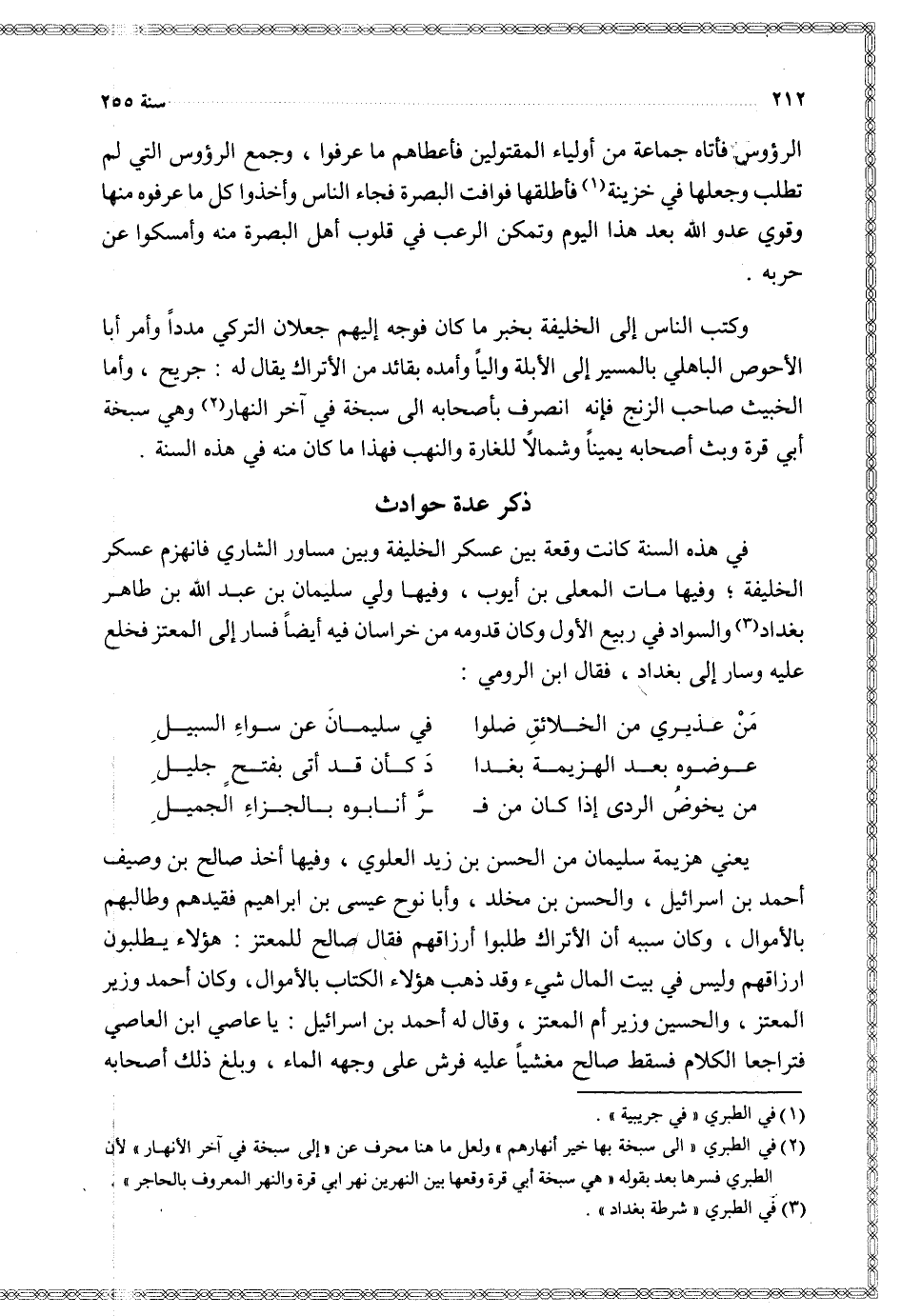 في هذه السنة كانت وقعة بين عسكر الخليفة وبين مساور الشاري فانهزم عسكر الخليفة وفيها مات المعلى بن أيوب وفيها ولي سليمان بن عبد الله بن طاهر بغداد والسواد في ربيع الأول وكان قدومه من خراسان فيه أيضا فسار إلى المعتز فخلع عليه وسار إلى بغداد فقال ابن الرومي