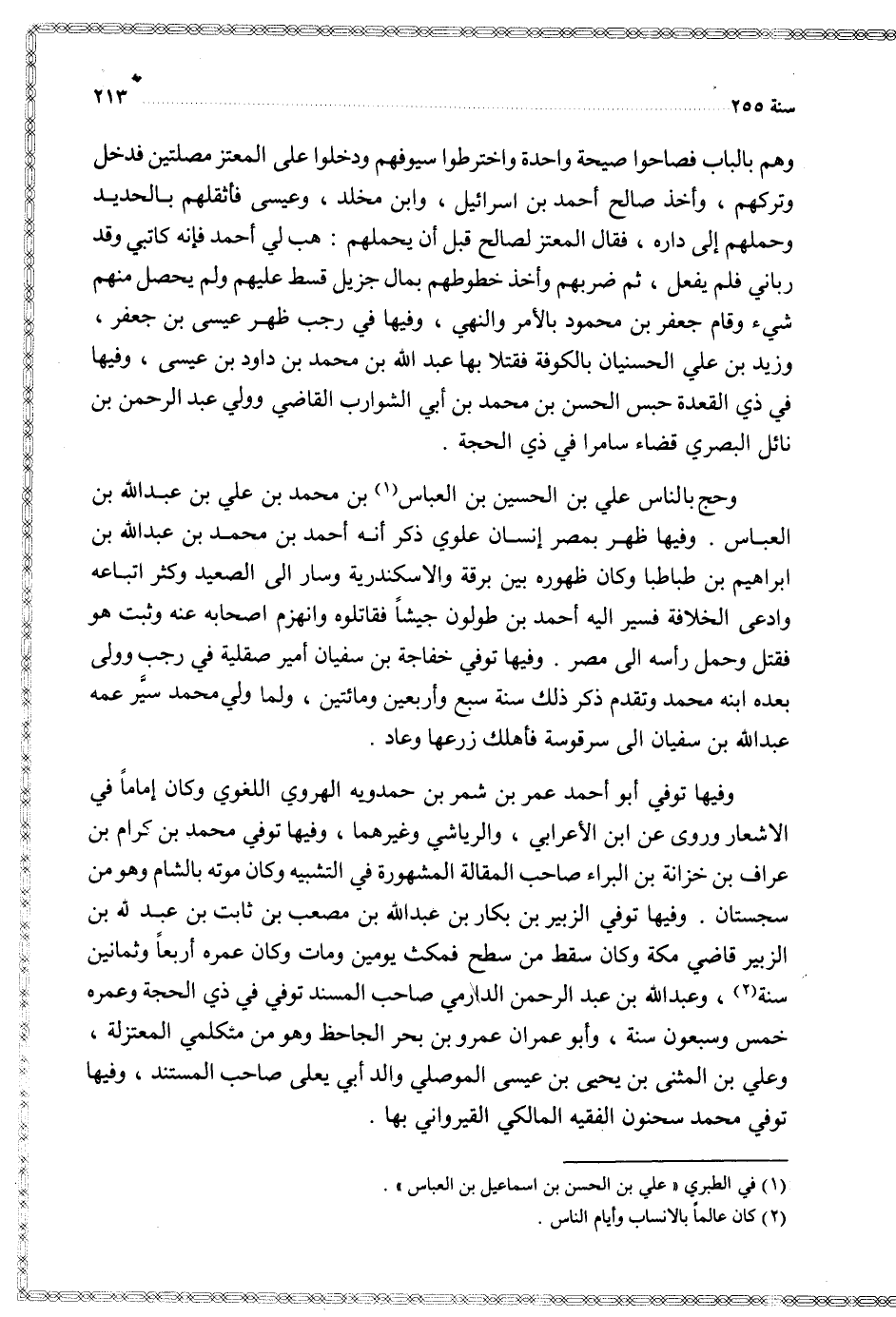 وفيها توفي الزبير بن بكار بن عبد الله بن مصعب بن ثابت بن عبد الله بن الزبير قاضي مكة وكان سقط من سطح فمكث يومين ومات وكان عمره أربعا وثمانين سنة وعبد الله بن عبد الرحمن الدارمي صاحب المسند توفي في ذي الحجة وعمره خمس وسبعون سنة وأبو عمران عمرو بن بحر الجاحظ وهو من متكلمي المعتزلة وعلي بن المثنى بن يحيى بن عيسى الموصلي والد أبي يعلى صاحب المسند وفيها توفي محمد سحنون الفقيه المالكي القيرواني بها