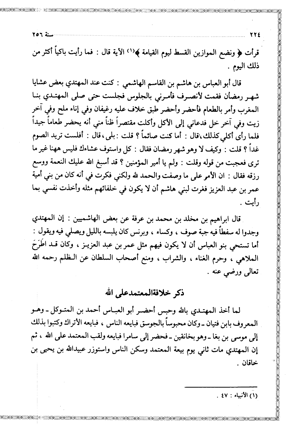 قال إبراهيم بن مخلد بن محمد بن عرفة عن بعض الهاشميين إن المهتدي وجدوا له سفطا فيه جبة صوف وكساء وبرنس كان يلبسه بالليل ويصلي فيه ويقول أما تستحي بنو العباس أن يكون فيهم مثل عمر بن عبد العزيز وكان قد اطرح الملاهي وحرم الغناء والشراب ومنع أصحاب السلطان عن الظلم رحمه الله تعالى ورضي عنه