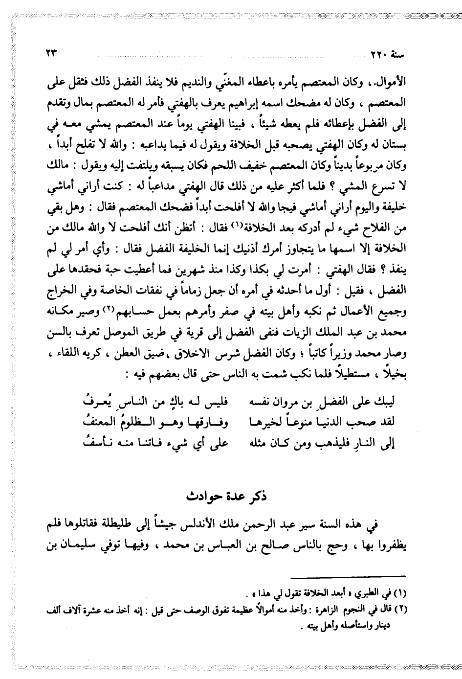 الأموال وكان المعتصم يأمره بإعطاء المغني والنديم فلا ينفذ الفضل ذلك فثقل على المعتصم وكان له مضحك اسمه إبراهيم يعرف بالهفتي فأمر له المعتصم بمال وتقدم إلى الفضل بإعطائه فلم يعطه شيئا فبينا الهفتي يوما عند المعتصم يمشي معه في بستان له وكان الهفتي يصحبه قبل الخلافة ويقول له فيما يداعبه والله لا تفلح أبدا وكان مربوعا بدينا وكان المعتصم خفيف اللحم فكان يسبقه يسبقه ويلتفت إليه ويقول مالك لا تسرع المشي فلما أكثر عليه من ذلك قال الهفتي مداعبا له كنت أراني أماشي خليفة واليوم أراني أماشي فيجا والله لا أفلحت أبدا فضحك المعتصم فقال وهل بقي من الفلاح شيء لم أدركه بعد الخلافة فقال أتظن أنك أفلحت لا والله مالك الخلافة إلا اسمها ما يتجاوز أمرك أذنيك إنما الخليفة الفضل فقال وأي أمر لي لم ينفذ فقال العفتي أمرت لي بكذا وكذا منذ شهرين فما أعطيت حبة فحقدها على الفضل فقيل أول ما أحدثه في أمره أن جعل زماما في نفقات خاصة وفي الخراج وجميع الأعمال ثم نكبه وأهل بيته في صفر وأمرهم بعمل حسابهم وصير مكانه محمد بن عبد الملك الزيات فنفى الفضل إلى قرية في طريق الموصل تعرف بالسن وصار محمد وزيرا كاتبا وكان الفضل شرس الأخلاق ضيق الطعن كريه اللقاء بخيلا مستطيلا فلما نكب شمت به الناس حتى قال بعضهم فيه
