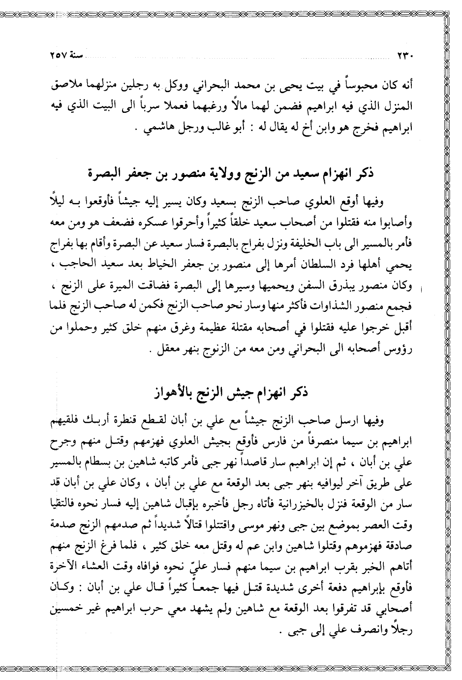 وفيها أوقع العلوي صاحب الزنج بسعيد وكان يسير إليه جيشا فأقعوا به ليلا وأصابوا منه فقتلوا من أصحاب سعيد خلقا كثيرا وأحرقوا عسكره فضعف هو ومن معه فأمر بالمسير إلى باب الخليفة ونزل بفراج بالبصرة فسار سعيد عن البصرة وأقام بها بفراج يحمي أهلها فرد السلطان أمرها إلى منصور بن جعفر الخياط بعد سعيد الحاجب وكان منصور يبذرق السفن ويحميها وسيرها إلى البصرة فضاقت الميرة على الزنج فجمع منصور الشذوات فأكثر منها وسار نحو صاحب الزنج فكمن له صاحب الزنج فلما أقبل خرجوا عليه فقتلوا في أصحابه مقتلة عظيمة وغرق منهم خلق كثير وحملوا من رؤوس أصحابه إلى البحراني ومن معه من الزنوج بنهر معقل