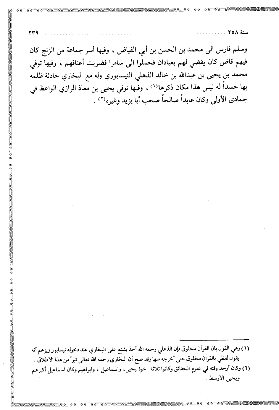 وسلم فارس إلى محمد بن الحسن بن أبي الفياض وفيها أسر جماعة من الزنج كان فيهم قاض كان يقضي لهم بعبادان فحملوا إلى سامرا فضربت أعناقهم وفيها توفي محمد بن يحيى بن عبد الله بن خالد الذهلي النيسابوري وله مع البخاري حادثة ظلمه بها حسدا له ليس هذا مكان ذكرها وفيها توفي يحيى بن معاذ الرازي الواعظ في جمادى الأولى وكان عابدا صالحا صحب أبا يزيد وغيره