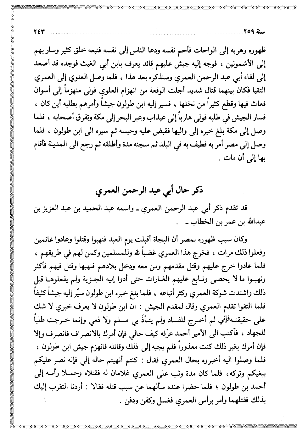 وكان سبب ظهوره بمصر أن البجاة أقبلت يوم العبد فنهبوا وقتلوا وعادوا غانمين وفعلوا ذلك مرات فخرج هذا العمري غضبا لله وللمسلمين وكمن لهم في طريقهم فلما عادوا خرج عليهم وقتل مقدمهم ومن معه ودخل بلادهم فنهبها وقتل فيهم فأكثر ونهبوا ما لا يحصى وتابع عليهم الغارات حتى أدوا إليه الجزية ولم يفعلوها قبل ذلك واشتدت شوكة العمري وكثر أتباعه فلما بلغ خبره ابن طولون سير إليه جيشا كثيفا فلما التقوا تقدم العمري وقال لمقدم الجيش ان ابن طولون لا يعرف خبري لا شك على حقيقته فإني لم أخرج للفساد ولم يتأذ بي مسلم ولا ذمي وإنما خرجت طلبا للجهاد فاكتب إلى الأمير أحمد عرفه كيف حالي فإن أمرك بالانصراف فانصرف وإلا فإن أمرك بغير ذلك كنت معذورا فلم يجبه إلى ذلك وقاتله فانهزم جيش ابن طولون فلما وصلوا إليه أخبروه بحال العمري فقال كنتم أنهيتم حاله إلي فإنه نصر عليكم ببغيكم وتركه فلما كان مدة وثب على العمري غلامان له فقتلاه وحملا رأسه إلى أحمد بن طولون فلما حضرا عنده سألهما عن سبب قتله فقالا أردنا التقرب إليك بذلك فقتلهما وأمر برأس العمري فغسل وكفن ودفن