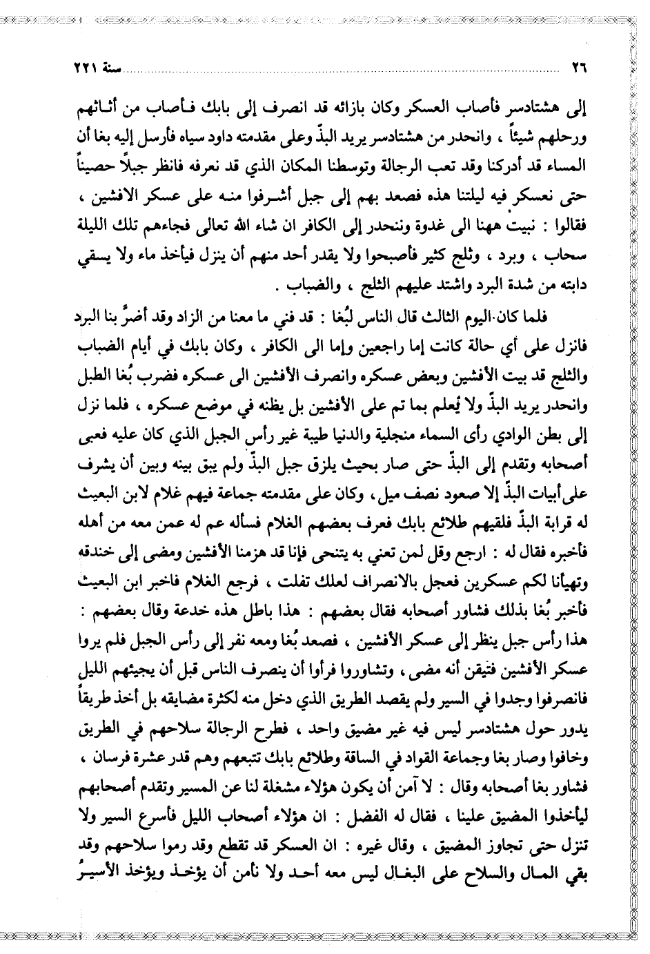 فلما كان اليوم الثالث قال الناس لبغا قد فني ما معنا من الزاد وقد أضر بنا البرد فانزل على أي حالة كانت إما راجعين وإما إلى الكافر وكان بابك في أيام الضباب والثلج قد بيت الأفشين وبعض عسكره وانصرف الأفشين إلى عسكره فضرب بغا الكبير الطبل وانحدر يريد البذ ولا يعلم بما تم على الأفشين بل يظنه في موضع عسكره فلما نزل إلى بطن الوادي رأى السماء منجلية والدنيا طيبة غير رأس الجبل الذي كان عليه فعبى أصحابه وتقدم إلى البذ حتى صار بحيث يزلق جبل البذ ولم يبق بينه وبين أن يشرف على أبيات البذ إلا صعود نصف ميل وكان على مقدمته جماعة فيهم غلام لابن البعيث له قرابة البذ فلقيهم طلائع بابك فعرف بعضهم الغلام فسأله عم له عمن معه من أهله فأخبره فقال له ارجع وقل لمن تعني به يتنحى فإنا قد هزمنا الأفشين ومضى إلى خندقه وتهيأنا لكم عسكرين فعجل بالانصراف لعلك تفلت فرجع الغلام فاخبر ابن البعيث فأخبر بغا بذلك فشاور أصحابه فقال بعضهم هذا باطل هذه خدعة وقال بعضهم هذا رأس جبل ينظر إلى عسكر الأفشين فصعد بغا ومعه نفر إلى رأس الجبل فلم يروا عسكر الأفشين فتيقن أنه مضى وتشاوروا فرأوا أن ينصرف الناس قبل أن يجيئهم الليل فانصرفوا وجدوا في السير ولم يقصد الطريق الذي دخل منه لكثرة مضايقه بل أخذ طريقا يدور حول هشتادسر ليس فيه غير مضيق واحد فطرح الرجالة سلاحهم في الطريق وخافوا وصار بغا وجماعة القواد في الساقة وطلائع بابك تتبعهم وهم قدر عشرة فرسان فشاور بغا أصحابه وقال لا آمن أن يكون هؤلاء مشغلة لنا عن المسير وتقد أصحابهم ليأخذوا المضيق علينا فقال له الفضل إن هؤلاء أصحاب الليل فأسرع السير ولا تنزل حتى تجاوز المضيق وقال غيره إن العسكر قد تقطع وقد رموا سلاحهم وقد بقي المال والسلاح على البغال ليس معه أحد ولا نأمن أن يؤخذ الأسير