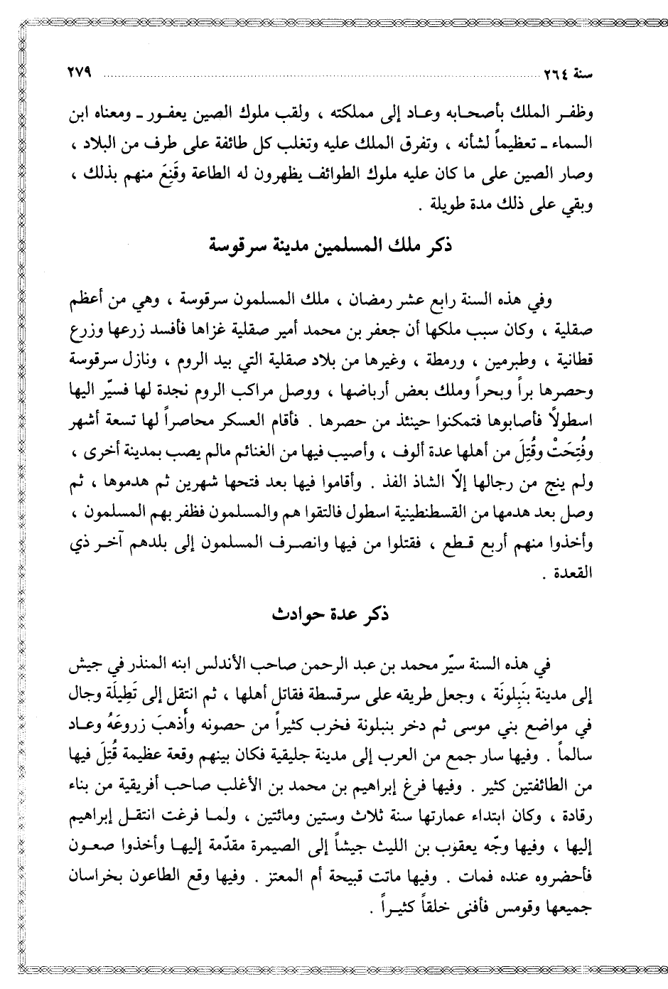 وفي هذه السنة رابع عشر رمضان ملك المسلمون سرقوسة وهي من أعظم صقلية وكان سبب ملكها أن جعفر بن محمد أمير صقلية غزاها فأفسد زرعها وزرع قطانية وطبرمين ورمطة وغيرها من بلاد صقلية التي بيد الروم ونازل سرقوسة وحصرها برا وبحرا وملك بعض أرباضها ووصل مراكب الروم نجدة لها فسير إليها اسطولا فأصابوها فتمكنوا حينئذ من حصرها