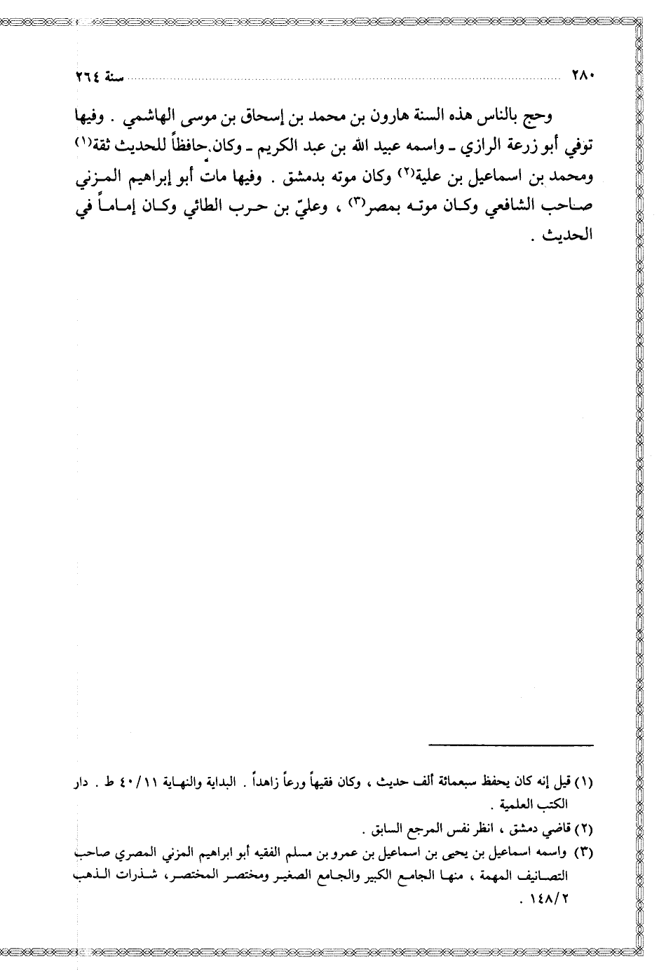 وفيها توفي أبو زرعة الرازي واسمه عبيد الله بن عبد الكريم وكان حافظا للحديث ثقة ومحمد بن إسماعيل بن علية وكان موته بدمشق