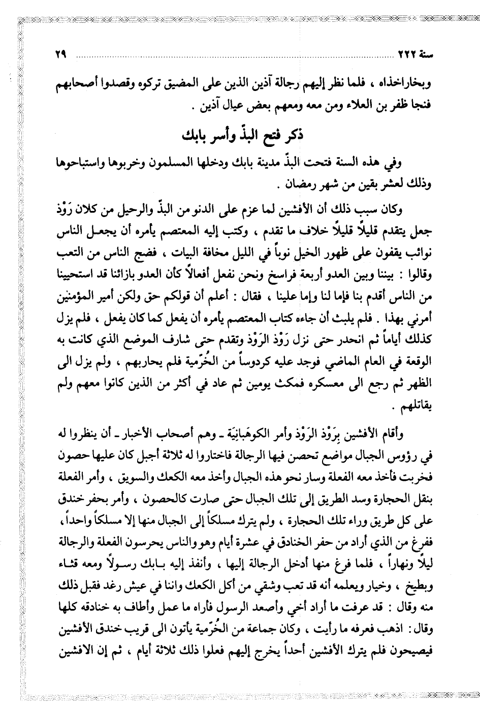 وفي هذه السنة فتحت البذ مدينة بابك ودخلها المسلمون وخربوها واستباحوها وذلك لعشر بقين من شهر رمضان
