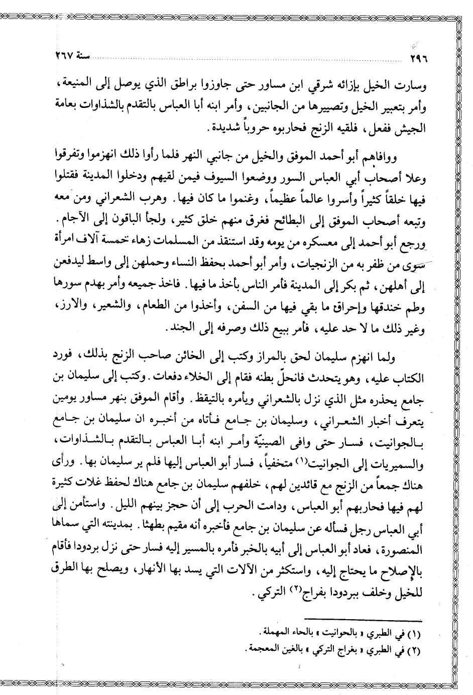 وسارت الخيل بإزائه شرقي ابن مساور حتى جاوزوا برطق الذي يوصل إلى المنيعة وأمر بتعبير الخيل وتصييرها من الجانبين وأمر انه أبا العباس بالتقدم بالشذاوات بعامة الجيش ففعل فلقيه الزنج فحاربوه حروبا شديدة