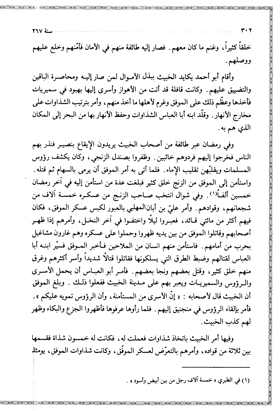 وفيها أمر الخبيث باتخاذ شذاوات فعملت له فكانت له خمسون شذاة فقسمها بين ثلاثة من قواده وأمرهم بالتعرض لعسكر الموفق وكانت شذاوات الموفق يومئذ
