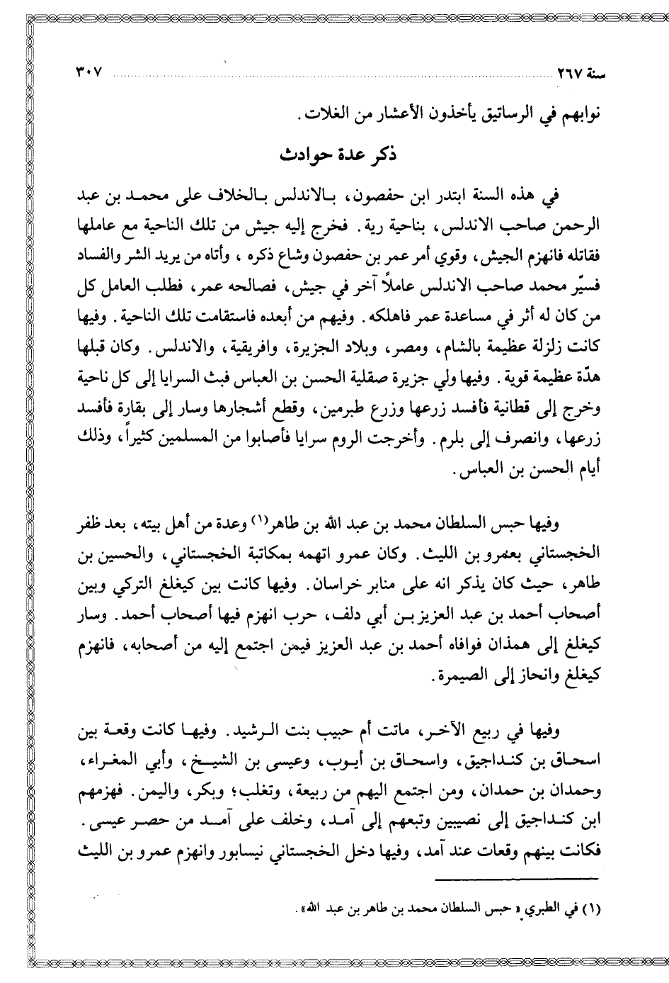 وفيها حبس السلطان محمد بن عبد الله بن طاهر وعدة من أهل بيته بعد ظفر الخجستاني بعمرو بن الليث