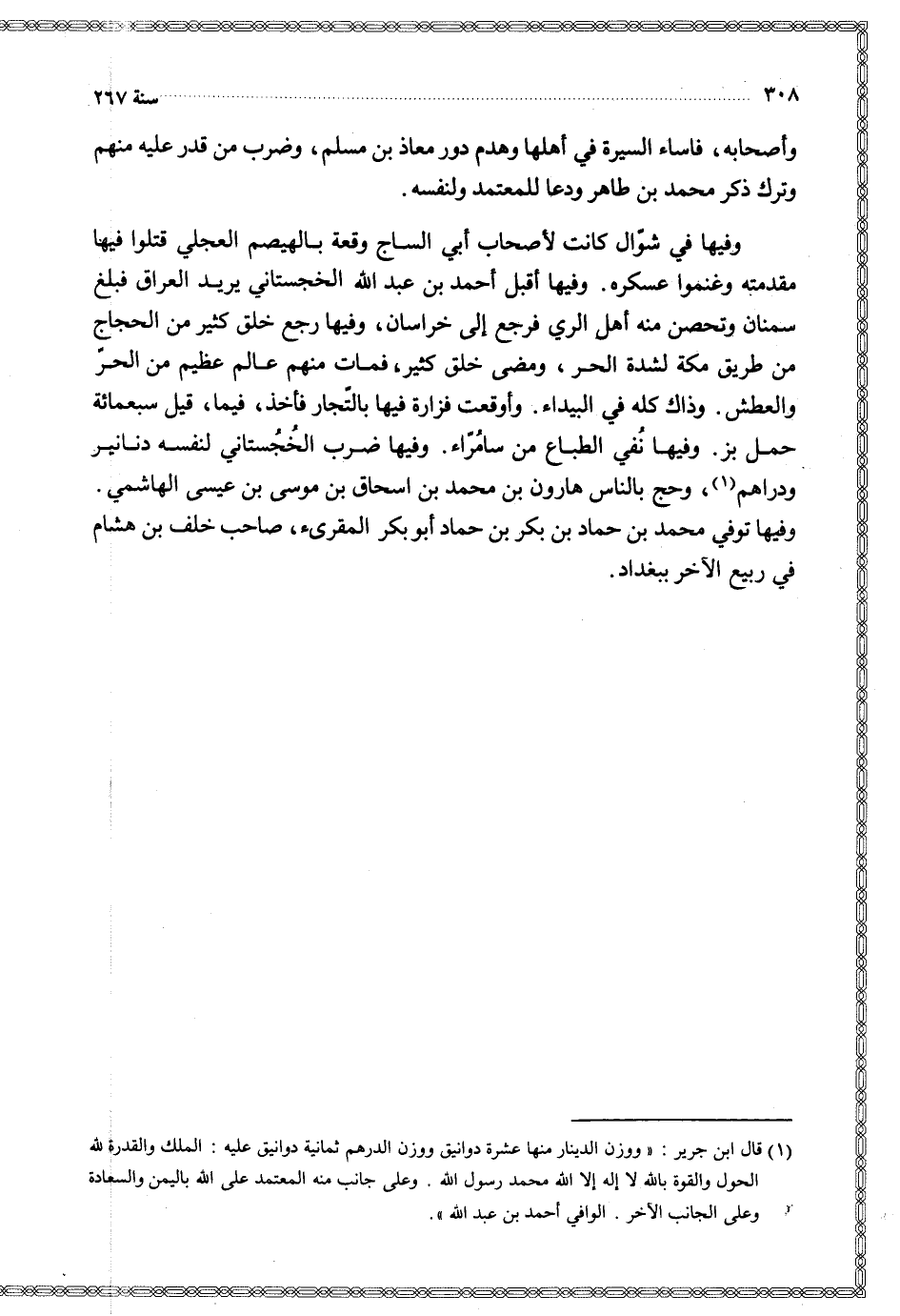 وفيها ضرب الخجستاني لنفسه دنانير ودراهم وحج بالناس هارون بن محمد بن إسحاق بن موسى بن عيسى الهاشمي