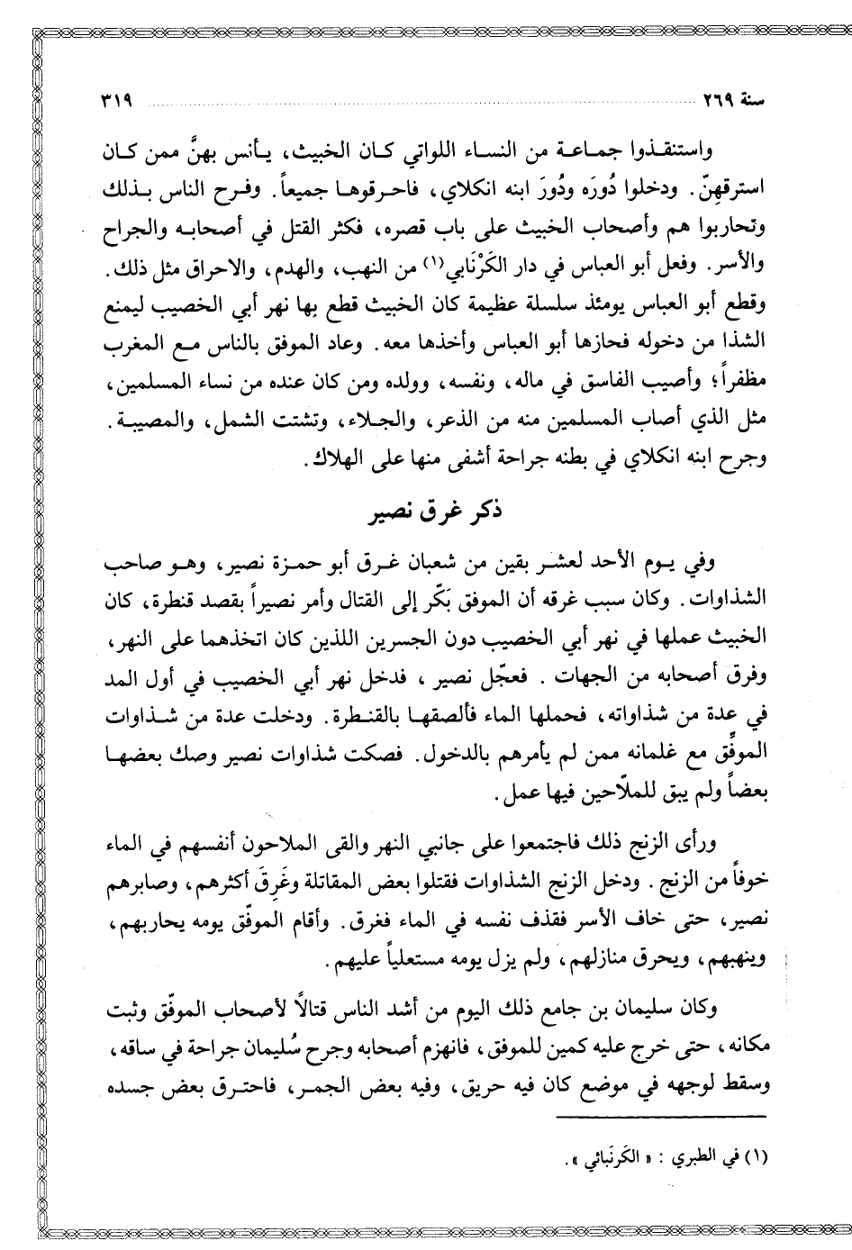 وكان سبب غرقه أن الموفق بكر إلى القتال وأمر نصيرا بقصد قنطرة كان الخبيث عملها في نهر أبي الخصيب دون الجسرين اللذين كان اتخذهما على النهر وفرق أصحابه من الجهات