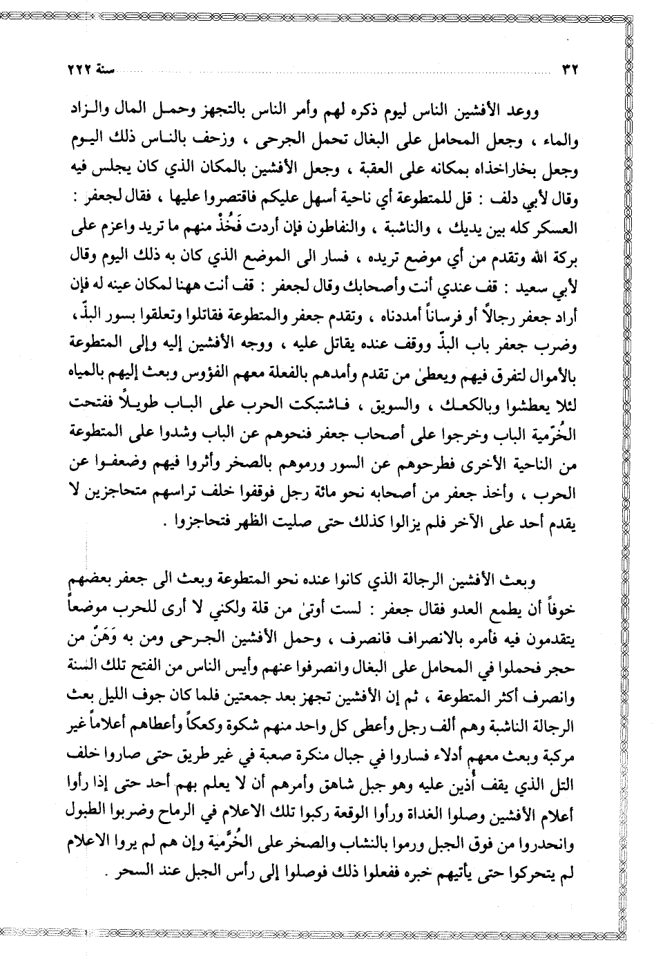 وبعث الأفشين الرجالة الذي كانوا عنده نحو المتطوعة وبعث إلى جعفر بعضهم خوفا أن يطمع العدو فقال جعفر لست أوتى من قلة ولكني لا أرى للحرب موضعا يتقدمون فيه فأمره بالانصراف فانصرف وحمل الأفشين الجرحى ومن به وهن من حجر فحملوا في المحامل على البغال وانصرفوا عنهم وأيس الناس من الفتح تلك السنة وانصرف أكثر المتطوعة ثم إن الأفشين تجهز بعد جمعيتن فلما كان جوف الليل بعث الرجالة الناشبة وهم ألف رجل وأعطى كل واحد منهم شكوة وكعكا وأعطاهم أعلاما غير مركبة وبعث معهم أدلاء فساروا في جبال منكرة صعبة في غير طريق حتى صاروا خلف التل الذي يقف أذين عليه وهو جبل شاهق وأمرهم أن لا يعلم بهم أحد حتى إذا رأوا أعلام الأفشين وصلوا الغداة ورأوا الوقعة ركبوا تلك الأعلام في الرماح وضربوا الطبول وانحدروا من فوق الجبل ورموا بالنشاب والصخر على الخرمية وإن هم لم يروا الأعلام لم يتحركوا حتى يأتيهم خبره ففعلوا ذلك فوصلوا إلى رأس الجبل عند السحر