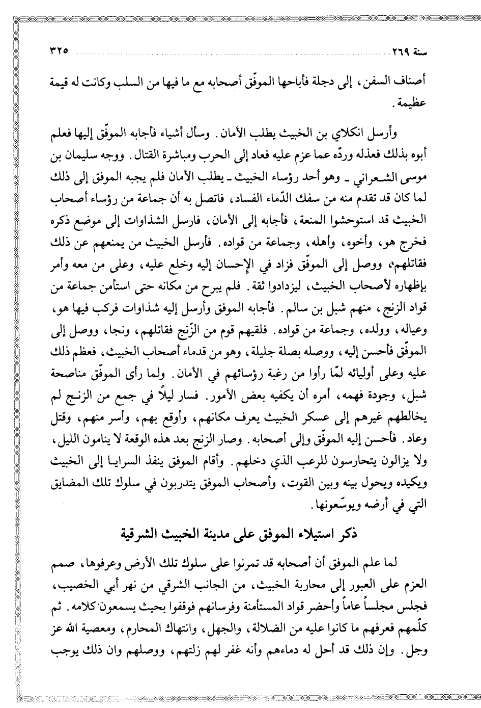 أصناف السفن إلى دجلة فأباحها الموفق أصحابه مع ما فيها من السلب وكانت له قيمة عظيمة
