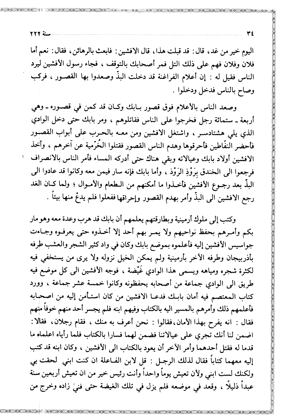 وكتب إلى ملوك أرمينية وبطارقتهم يعلمهم أن بابك قد هرب وعدة معه وهو مار بكم وأمرهم بحفظ نواحيهم ولا يمر بهم أحد إلا أخذوه حتى يعرفوه وجاءت جواسيس الأفشين إليه فأعلموه بموضع بابك وكان في واد كثير الشجر والعشب طرفه بأذربيجان وطرفه الآخر بأرمينية ولم يمكن الخيل نزوله ولا يرى من يستخفي فيه لكثرة شجره ومياهه ويسمى هذا الوادي غيضة فوجه الأفشين إلى كل موضع فيه طريق إلى الوادي جماعة من أصحابه يحفظونه وكانوا خمسة عشر جماعة وورد كتاب المعتصم فيه أمان بابك فدعا الأفشين من كان استأمن إليه من أصحابه فأعلمهم ذلك وأمرهم بالمسير إليه بالكتاب وفيهم ابنه فلم يجسر أحد منهم خوفا منهم فقال إنه يفرج بهذا الأمان فقالا نحن أعرف به منك فقام رجلان فقالا أضمن لنا أنك تجري على عيالاتنا فضمن لهما فسارا بالكتاب فلما رأياه اعلماه ما قدما له فقتل أحدهما وأمر الآخر أن يعود بالكتاب إلى الأفشين وكان ابنه قد كتب إليه معهما كتابا فقال لذلك الرجل قل لابن الفاعلة إن كنت ابني لحقت بي ولكنك لست ابني ولأن تعيش يوما واحدا وأنت رئيس خير نم أن تعيش أربعين سنة عبدا ذليلا وقعد في موضعه فلم يزل في تلك الغيضة حتى فنى زاده وخرج من