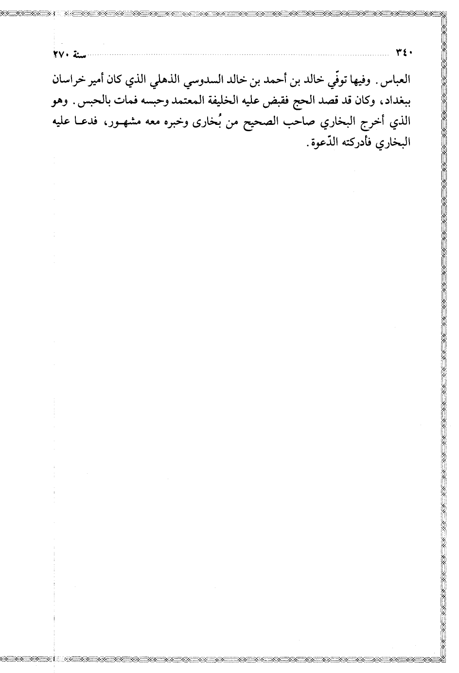 وفيها توفي خالد بن أحمد بن خالد السدوسي الذهلي الذي كان أمير خراسان ببغداد وكان قد قصد الحج فقبض عليه الخليفة المعتمد وحبسه فمات بالحبس