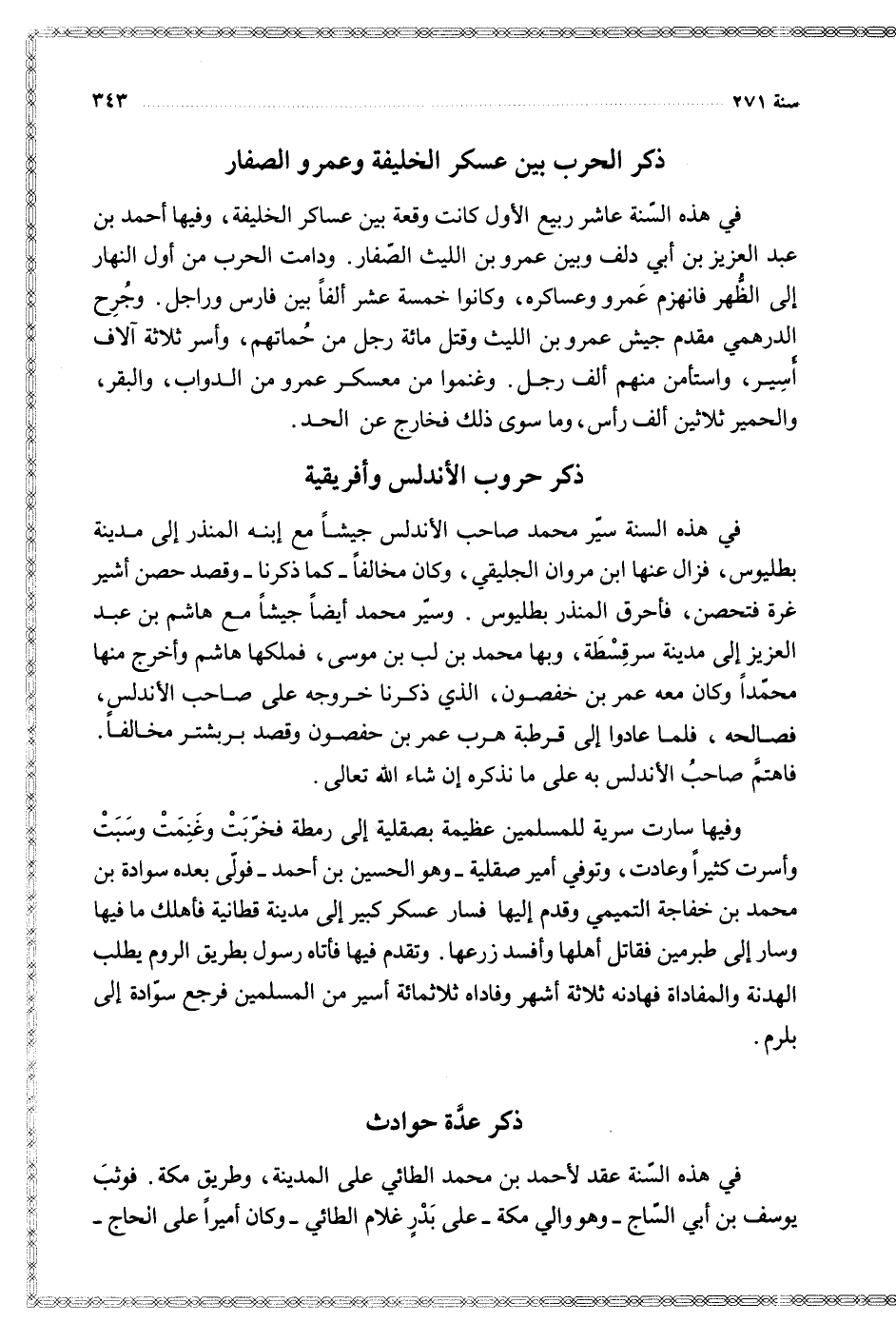 في هذه السنة عاشر ربيع الأول كانت وقعة بين عساكر الخليفة وفيها أحمد بن عبد العزيز بن أبي دلف وبين عمرو بن الليث الصفار