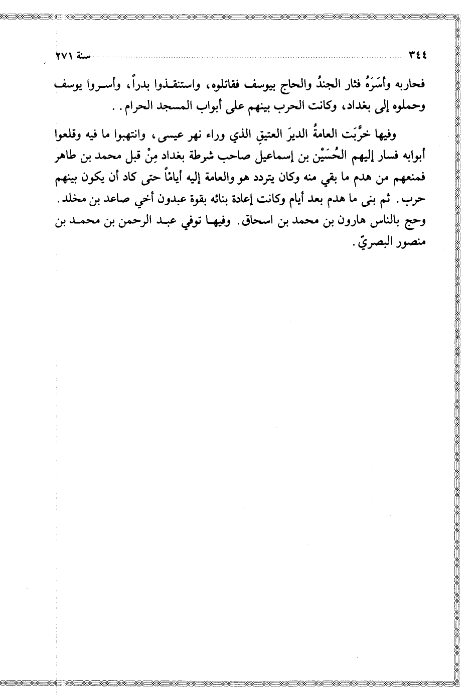 وفيها خربت العامة الدير العتيق الذي وراء نهر عيسى وانتهبوا ما فيه وقلعوا أبوابه فسار إليهم الحسين بن إسماعيل صاحب شرطة بغداد من قبل محمد بن طاهر فمنعهم من هدم ما بقي منه وكان يتردد هو والعامة إليه أياما حتى كاد أن يكون بينهم حرب