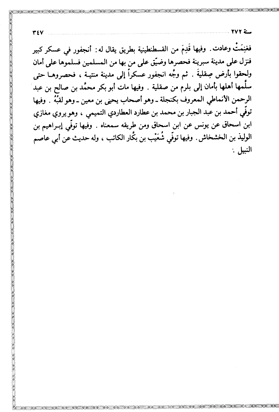 وفيها توفي أحمد بن عبد الجبار بن محمد بن عطارد العطاردي التميمي وهو يروي مغازي ابن إسحاق عن يونس عن ابن إسحاق ومن طريقه سمعناه