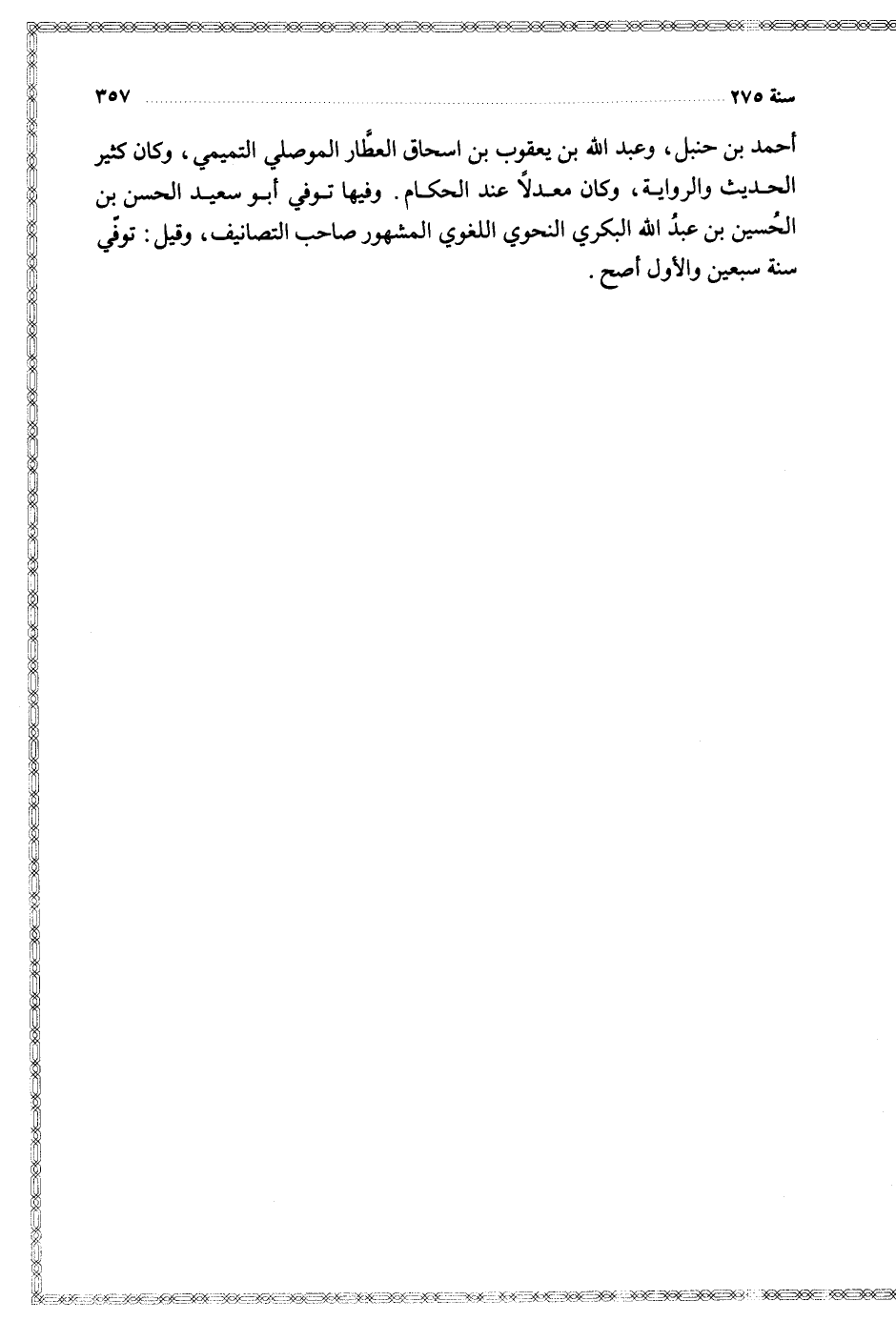 وفيها توفي أبو سعيد الحسن بن الحسين بن عبد الله البكري النحوي اللغوي المشهور صاحب التصانيف وقيل توفي سنة سبعين والأول أصح