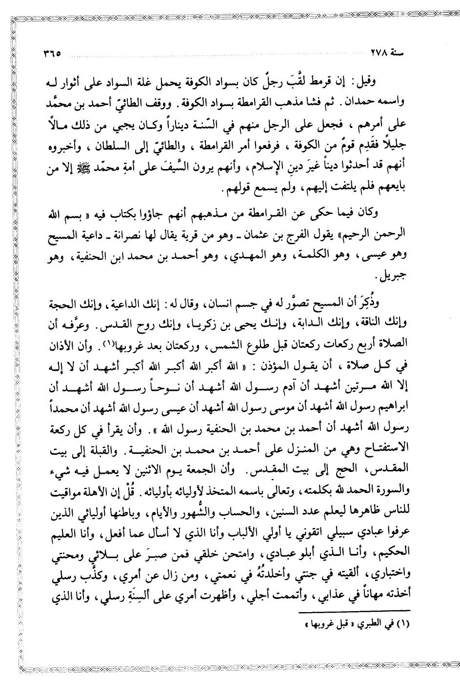 وكان فيما حكى عن القرامطة من مذهبهم أنهم جاؤوا بكتاب فيه بسم الله الرحمن الرحيم يقول الفرج بن عثمان وهو من قرية يقال لها نصرانة داعية المسيح وهو عيسى وهو الكلمة وهو المهدي وهو أحمد بن محمد ابن الحنفية وهو جبريل