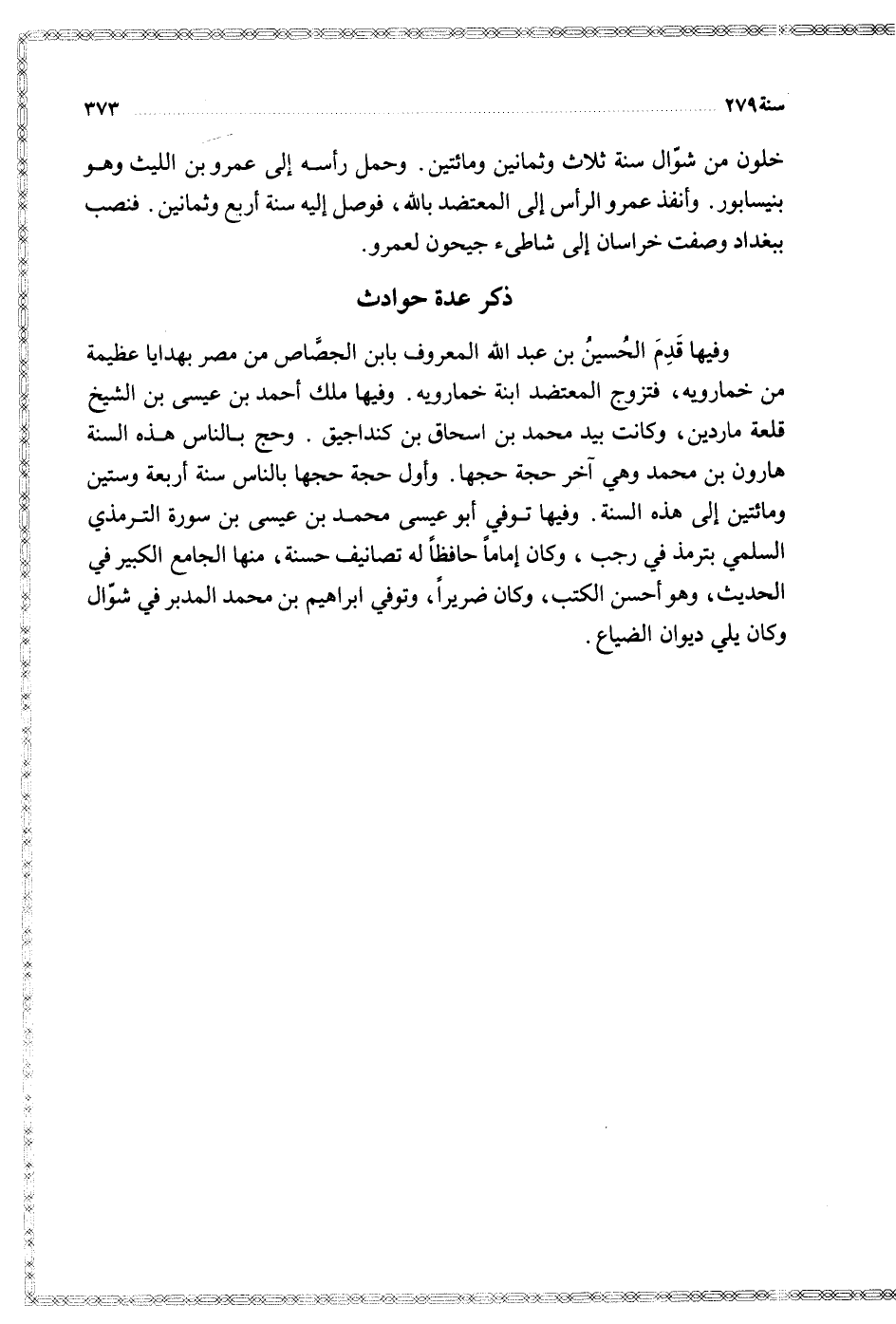 وفيها توفي أبو عيسى محمد بن عيسى بن سورة الترمذي السلمي بترمذ في رجب وكان إماما حافظا له تصانيف حسنة منها الجامع الكبير في الحديث وهو أحسن الكتب وكان ضريرا وتوفي إبراهيم بن محمد المدبر في شوال وكان يلي ديوان الضياع