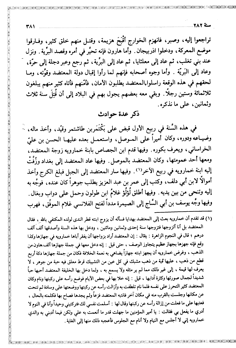 وفيها قدم ابن الجصاص بابنة خمارويه زوجة المعتضد ومعها أحد عمومتها وكان المعتضد بالموصل