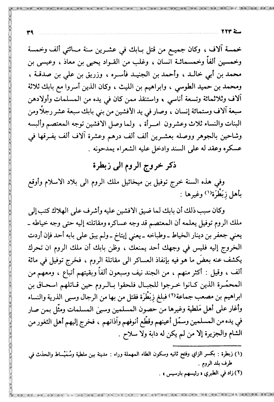 وفي هذه السنة خرج توفيل بن ميخائيل ملك الروم إلى بلاد الإسلام وأوقع بأهل زبطرة وغيرها