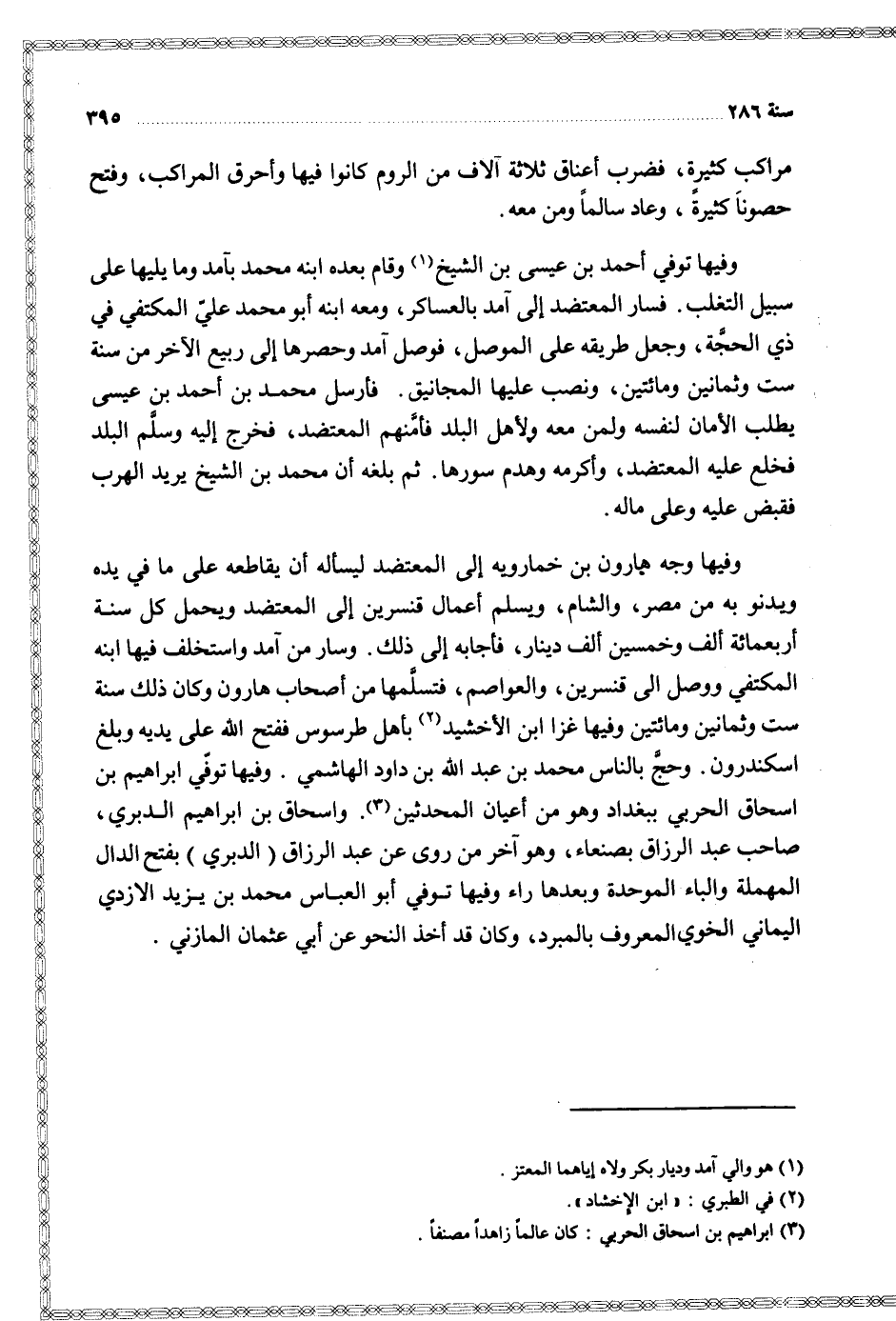 وفيها وجه هارون بن خمارويه إلى المعتضد ليسأله أن يقاطعه على ما في يده ويدنو به من مصر والشام ويسلم أعمال قنسرين إلى المعتضد ويحمل كل سنة أربعمائة ألف وخمسين ألف دينار فأجابه إلى ذلك