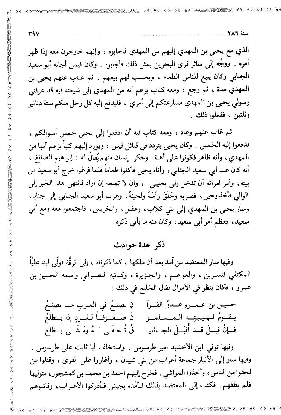 وفيها سار المعتضد من آمد بعد أن ملكها كما ذكرناه إلى الرقة فولى ابنه عليا المكتفي قنسرين والعواصم والجزيرة وكاتبه النصراني واسمه حسين بن عمرو فكان ينظر في الأموال فقال الخليع في ذلك