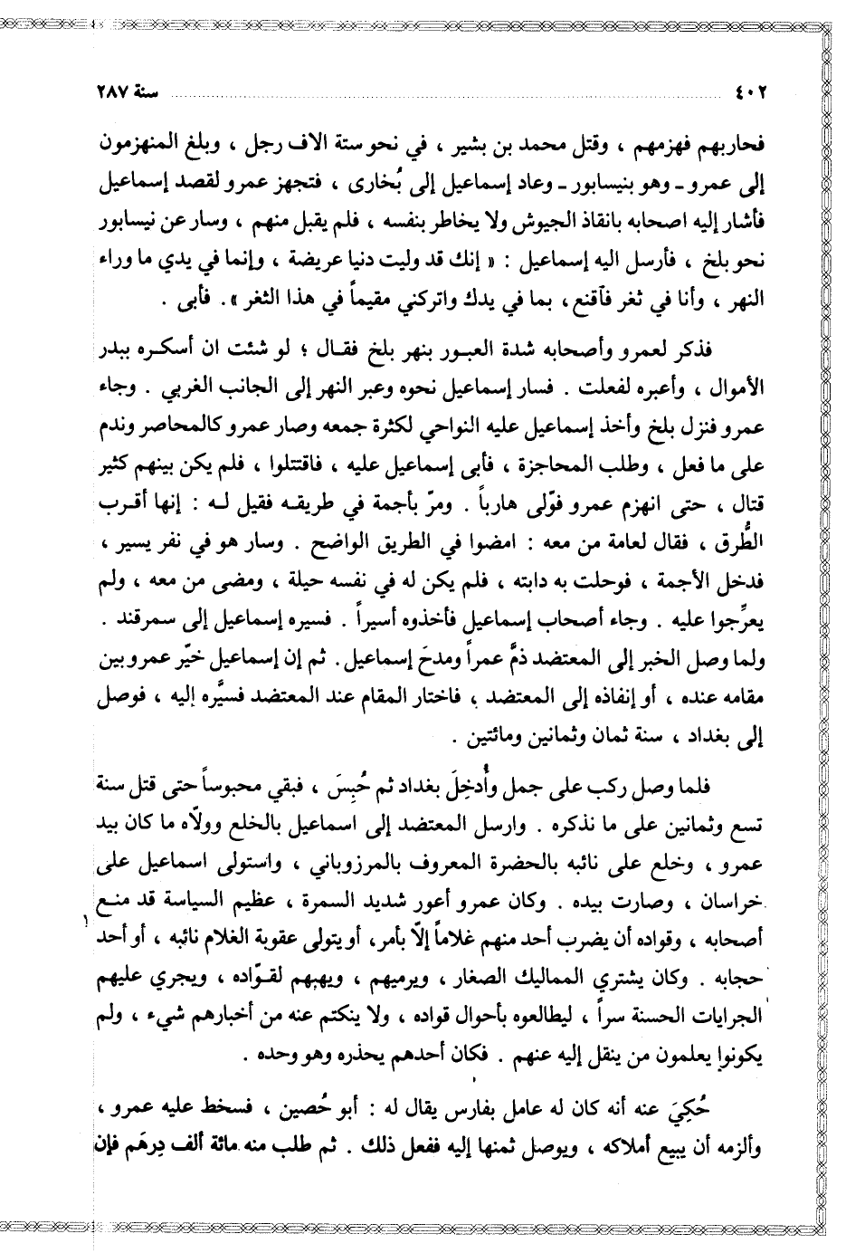 ثم إن إسماعيل خير عمرو بين مقامه عنده أو إنفاذه إلى المعتضد فاختار المقام عند المعتضد فسيره إليه فوصل إلى بغداد سنة ثمان وثمانين ومائتين