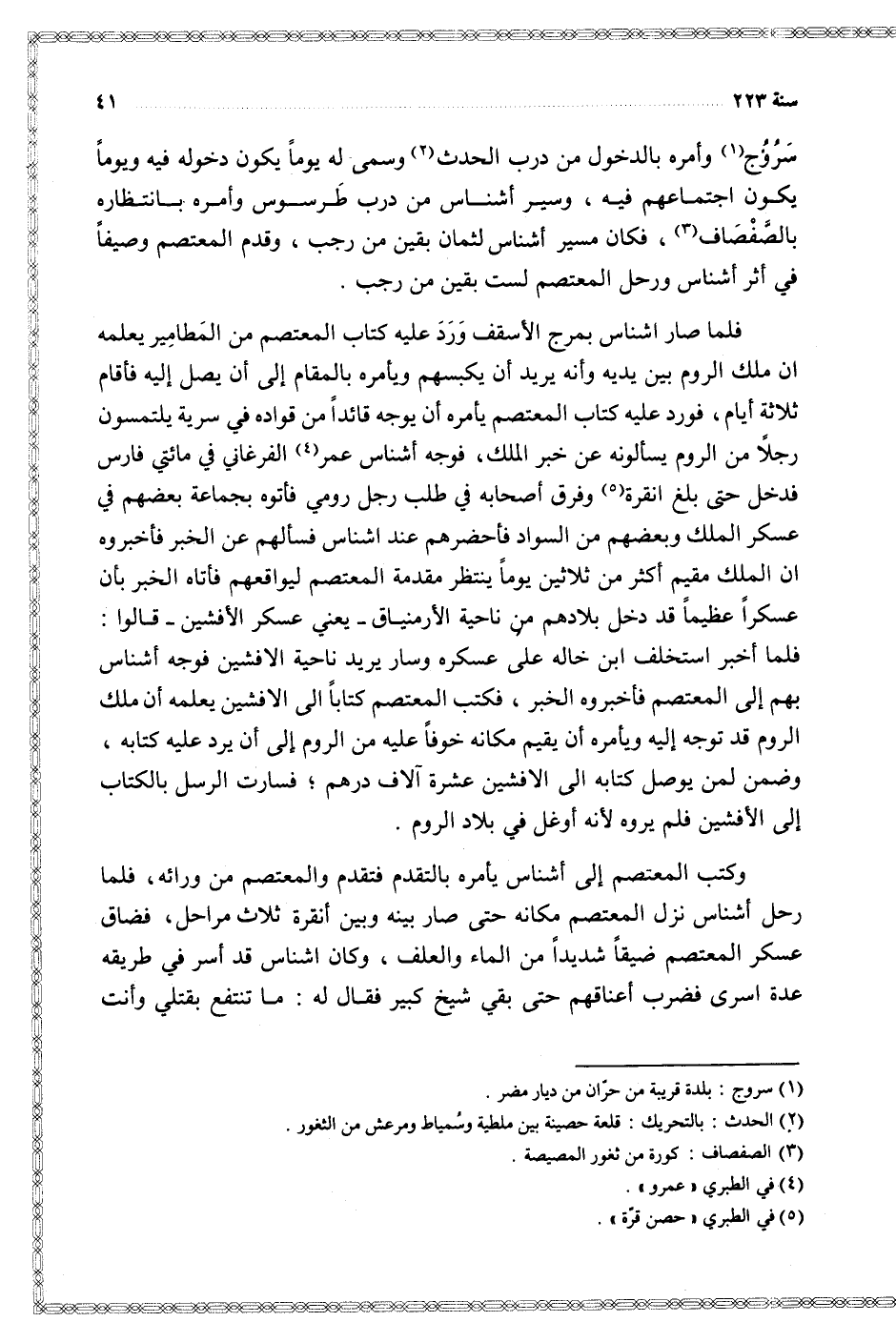 سروج وأمره بالدخول من درب الحدث سمى له يوما يكون دخوله فيه ويوما يكون اجتماعهم فيه وسير أشناس من درب طرسوس وأمره بانتظاره بالصفصاف فكان مسر أشناس لقمان بقين من رجب وقدم المعتصم وصيفا في أثر أشناس ورحل المعتصم لست بقين من رجب