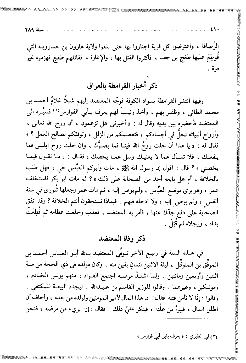 وفيها انتشر القرامطة بسواد الكوفة فوجه المعتضد إليهم شبلا غلام أحمد بن محمد الطائي وظفر بهم وأخذ رئيسا لهم يعرف بأبي الفوارس فسيره إلى المعتضد فأحضره بين يديه وقال له أخبرني هل تزعمون أن روح الله وأرواح الأنبياء تحل في أجسادكم فتعصمكم من الزلل وتوفقكم لصالح العمل فقال له يا هذا أن حلت روح الله فينا فما يضرك وإن حلت روح إبليس فما ينفعك فلا تسأل عما لا يعنيك وسل عما يخصك فقال ما تقول فيما يخصني قال أقول إن رسول الله مات وأبوكم العباس حي فهل طلب بالخلافة أم هل بايعه أحد من أصحابه على ذلك ثم مات أبو بكر فاستخلف عمر وهو يرى موضع العباس ولم يوص إليه ثم مات عمر وجعلها شورى في ستة أنفس ولم يوص إليه ولا أدخله فيهم