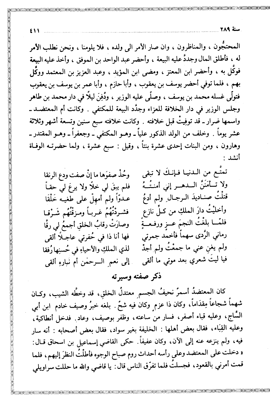 المحتجون والمناظرون وإن صار الأمر إلى ولده فلا يلومنا ونحن نطلب الأمر له فأطلق المال وجدد عليه البيعة وأحضر عبد الواحد بن الموفق وأخذ عليه البيعة فوكل به وأحضر ابن المعتز ومضى ابن المؤيد وعبد العزيز بن المعتمد ووكل بهم فلما توفي أحضر يوسف بن يعقوب وأبا حازم وأبا عمر بن يوسف بن يعقوب فتولى غسله محمد بن يوسف وصلى عليه الوزير ودفن ليلا في دار محمد بن طاهر وجلس الوزير في دار الخلافة للعزاء وجدد البيعة للمكتفي