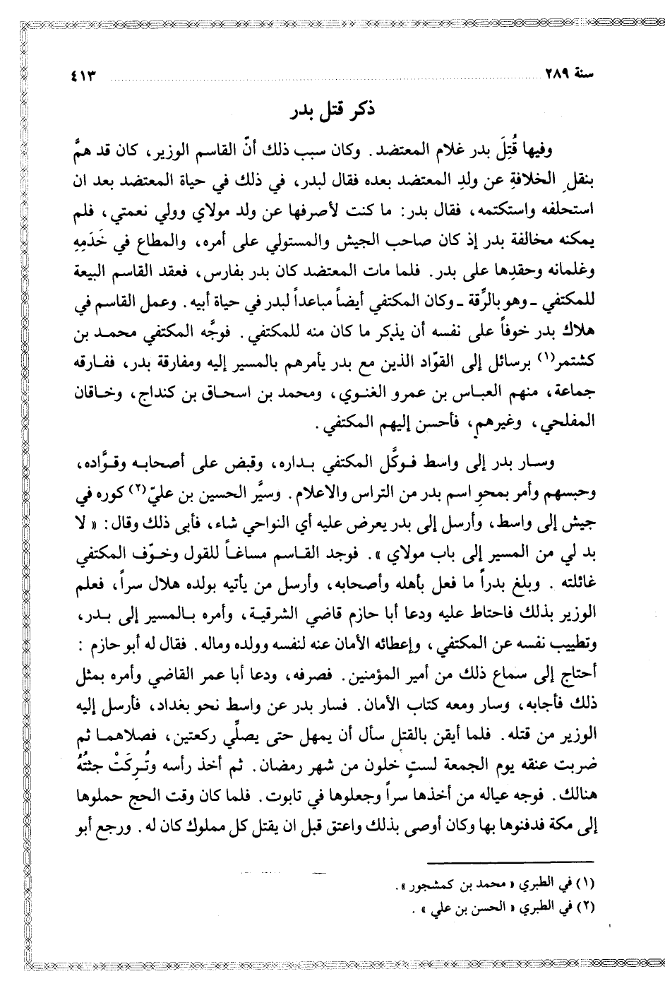 فلما مات المعتضد كان بدر بفارس فعقد القاسم البيعة للمكتفي وهو بالرقة وكان المكتفي أيضا مباعدا لبدر في حياة أبيه