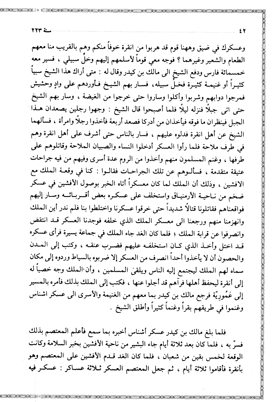 وعسكرك في ضيق وههنا قوم قد هربوا من أنقرة خوفا منكم وهم بالقريب منا معهم الطعام والشعير وغيرهما فوجه معي قوما لأسلمهم إليهم وخلى سبيلي فسير معه خمسمائة فارس ودفع الشيخ إلى مالك بن كيدر وقال له متى أراك هذا الشيخ سبيا كثيرا أو غنيمة كثيرة فخل سبيله فسار بهم الشيخ فأوردهم على واد وحشيش فمرجوا دوابهم وشربوا وأكلوا وساروا حتى خرجوا من الغيضة وسار بهم الشيخ حتى أتى جبلا فنزله ليلا فلما أصبحوا قال الشيخ وجهوا رجلين يصعدان هذا الجبل فينظران ما فوقه فيأخذان من أدركا فصعد أربعة فأخذوا رجلا وامرأة فسألهما الشيخ عن أهل أنقرة فدلوه عليهم فسار بالناس حتى أشرف على أهل أنقرة وهم في طرف ملاحة فلما رأوا العسكر أدخلوا النساء والصبيان الملاحة وقاتلوهم على طرفها وغنم المسلمون منهم وأخذوا من الروم عدة أسرى وفيهم من فيه جراحات عتيقة متقدمة فسألوهم عن تلك الجراحات فقالوا كنا في وقعة الملك مع الأفشين وذلك أن الملك لما كان معسكرا أتاه الخبر بوصول الأفشين في عسكر ضخم من ناحية الأرمنياق واستخلف على عسكره بعض أقربائه وسار إليهم فواقعناهم فقاتلونا قتالا شديدا حتى خرقوا عسكرنا واختلطوا بنا فلم ندر أين الملك وانهزمنا منهم ورجعنا إلى معسكر الملك الذي خلفه فوجدنا العسكر قد انتفض وانصرفوا عن قرابة الملك فلما كان الغد جاء الملك في جماعة يسيرة فرأى عسكره قد اختل وأخذ الذي كان استخلفه عليهم فضرب عنقه وكتب إلى المدن والحصون أن لا يأخذوا أحدا انصرف من العسكر إلا ضربوه بالسياط وردوه إلى مكان سماه لهم الملك ليجتمع إليه الناس ويلقى المسلمين وأن الملك وجه خصيا له إلى أنقرة ليحفظ أهلها فرآهم قد أجلوا عنها فكتب إلى الملك بذلك فأمره بالمسير إلى عمورية فرجع مالك بن كيدر بما معهم من الغنيمة والأسرى إلى عسكر أشناس وغنموا في طريقهم بقرا وغنما كثيرا وأطلق الشيخ