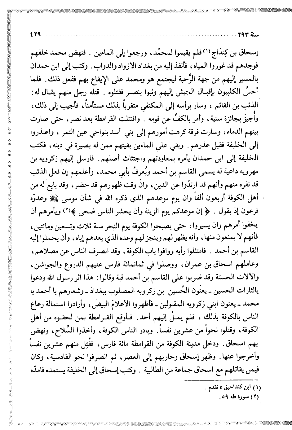 وظهر إسحاق وحاربهم إلى العصر ثم انصرفوا نحو القادسية وكان فيمن يقاتلهم مع إسحاق جماعة من الطالبية