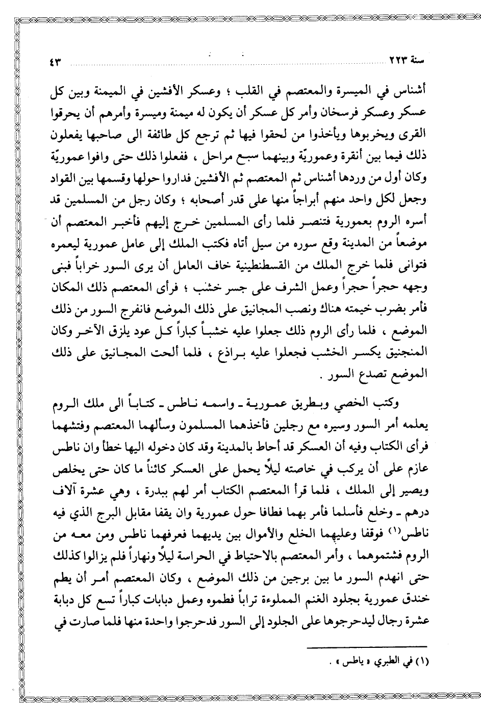 أشناس في الميسرة والمعتصم في القلب وعسكر الأفشين في الميمنة وبين كل عسكر وعسكر فرسخان وأمر كل عسكر أن يكون له ميمنة وميسرة وأمرهم أن يحرقوا القرى ويخربوها ويأخذوا من لحقوا فيها ثم ترجع كل طائفة إلى صاحبها يفعلون ذلك فيما بين أنقرة وعمورية وبينهما سبع مراحل ففعلوا ذلك حتى وافوا عمورية وكان أول من وردها أشناس ثم المعتصم ثم الأفشين فداروا حولها وقسمها بين القواد وجعل لكل واحد منهم أبراجا منها على قدر أصحابه وكان رجل من المسلمين قد أسره الروم بعمورية فتنصر فلما رأى المسلمين خرج إليهم فأخبر المعتصم أن موضعا من المدينة وقع سوره من سيل أتاه فكتب الملك إلى عامل عمورية ليعمره فتوانى فلما خرج الملك من القسطنطينية خاف العامل أن يرى السور خرابا فبنى وجهه حجرا حجرا وعمل الشرف على جسر خشب فرأى المعتصم ذلك المكان فأمر بضرب خيمته هناك ونصب المجانيق على ذلك الموضع فانفرج السور من ذلك الموضع فلما رأى الروم ذلك جعلوا عليه خشبا كبارا كل عود يلزق الآخر وكان المنجنيق يكسر الخشب فجعلوا عليه براذع فلما ألحت المجانيق على ذلك الموضع تصدع السور