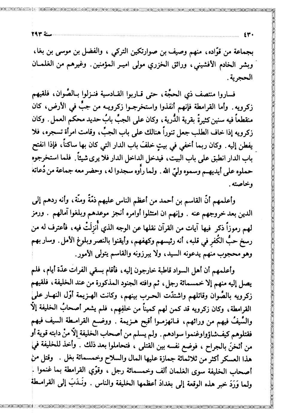 وأعلمهم أن أهل السواد قاطبة خارجون إليه فأقام بسقي الفرات عدة أيام فلم يصل إليه منهم إلا خمسمائة رجل ثم وافته الجنود المذكورة من عند الخليفة فلقيهم زكرويه بالصوان وقاتلهم واشتدت الحرب بينهم وكانت الهزيمة أول النهار على القرامطة وكان زكرويه قد كمن لهم كمينا من خلفهم فلم يشعر أصحاب الخليفة إلا والسيف فيهم من ورائهم فانهزموا أقبح هزيمة