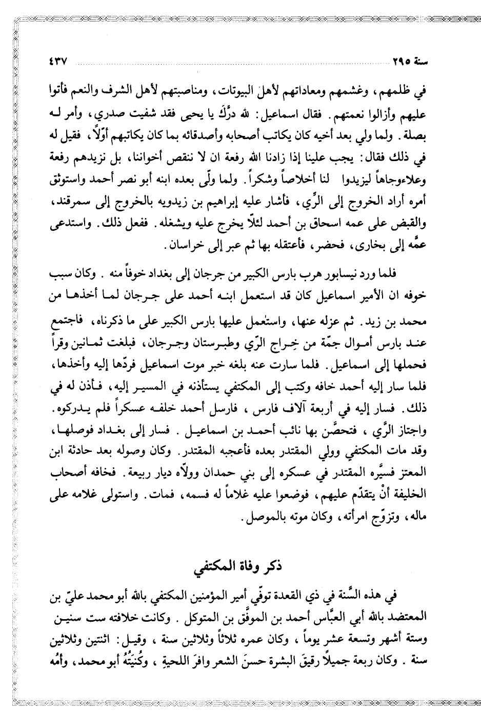 في هذه السنة في ذي القعدى توفي أمير المؤمنين المكتفي بالله أبو محمد علي بن المعتضد بالله أبي العباس أحمد بن الموفق بن المتوكل