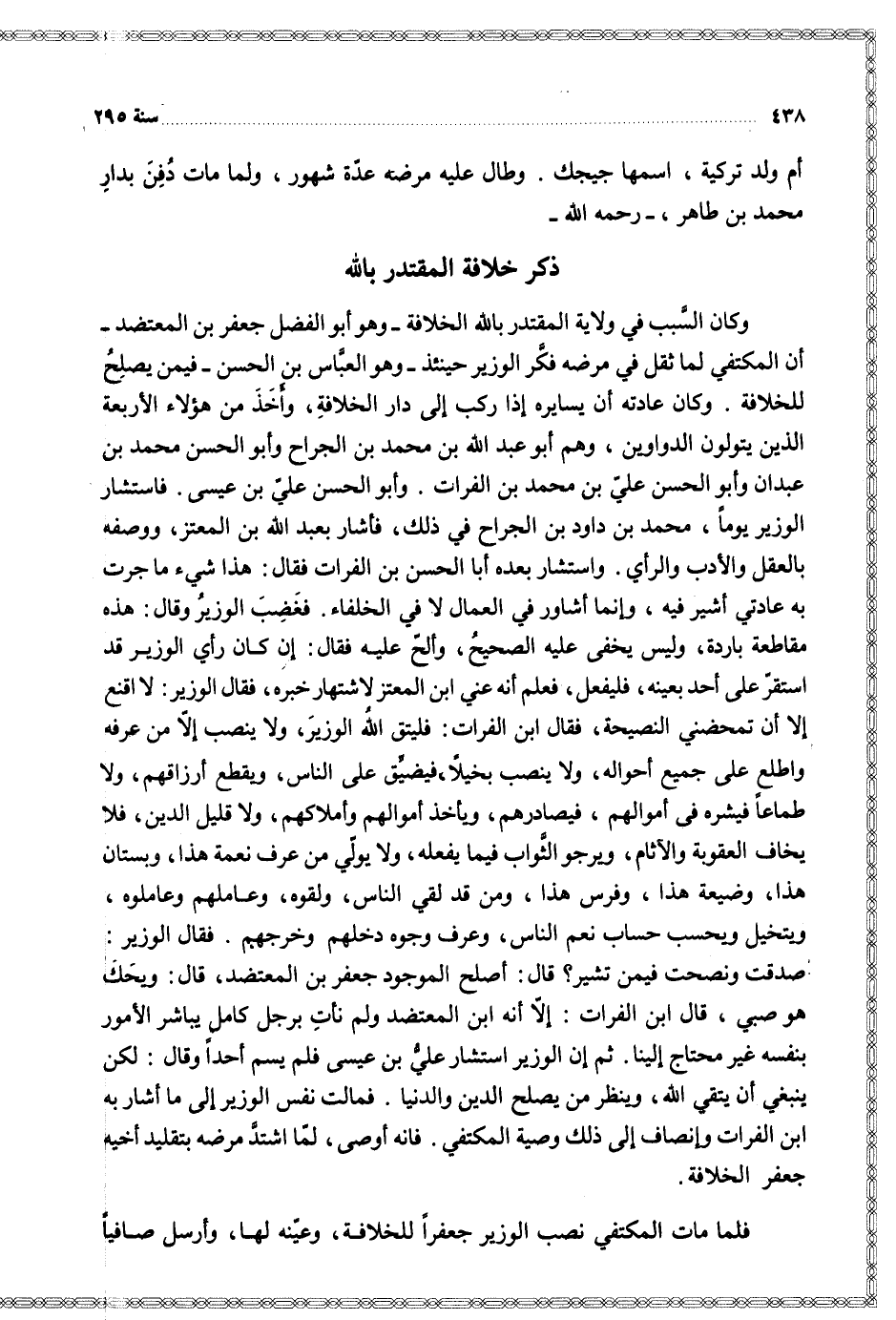 فقال الوزير صدقت ونصحت فيمن تشير قال أصلح الموجود جعفر بن المعتضد قال ويحك هو صبي قال ابن الفرات إلا أنه ابن المعتضد ولم نأت برجل كامل يباشر الأمور بنفسه غير محتاج إلينا