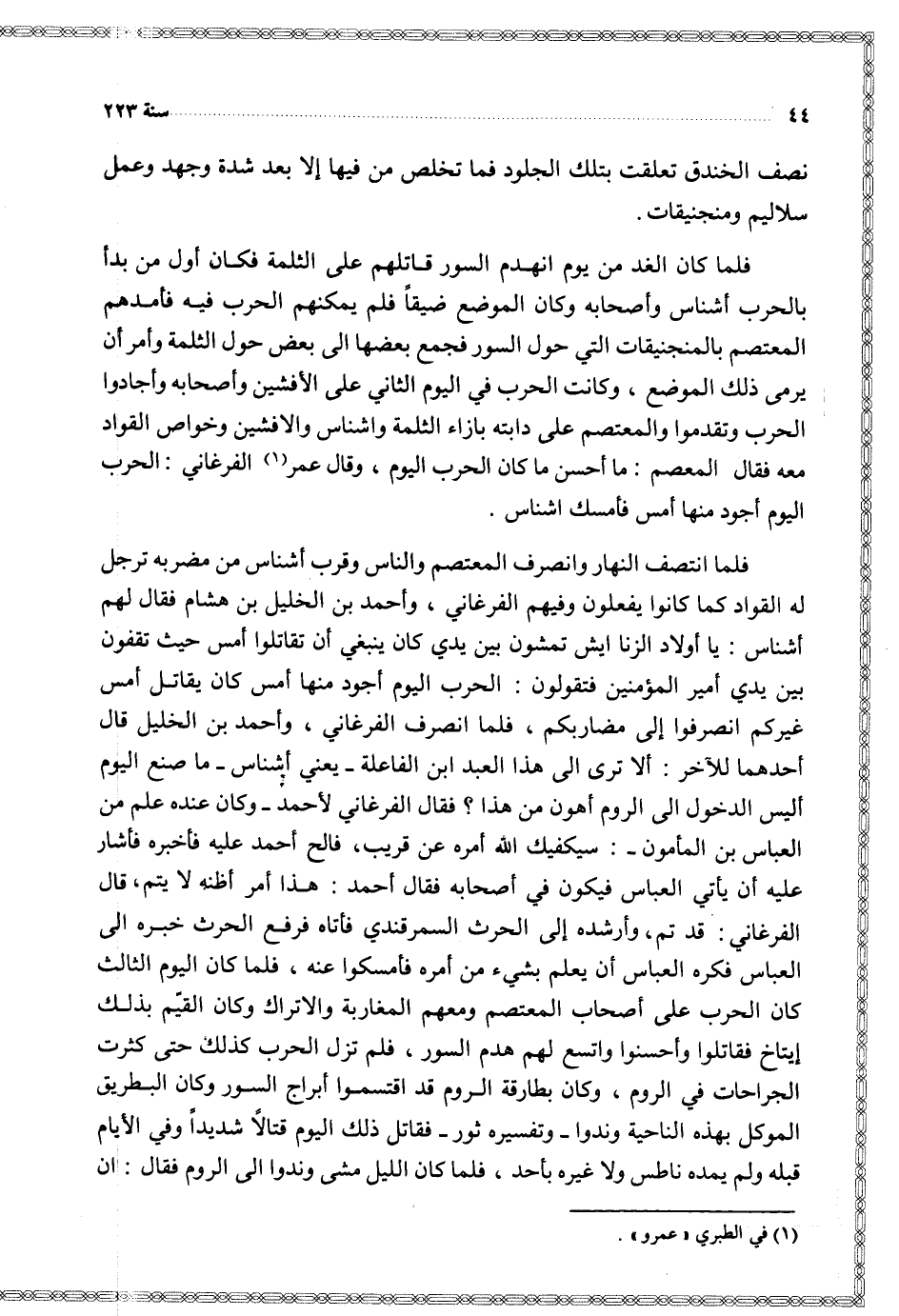 فلما انتصف النهار وانصرف المعتصم والناس وقرب أشناس من مضربة ترجل له القواد كما كانوا يفعلون وفيهم الفرغاني وأحمد بن الخليل بن هشام فقال لهم أشناس يا أولاد الزنا تمشون بين يدي كان ينبغي أن تقاتلوا أمس حيث تقفون بين يدي أمير المؤمنين فتقولون الحرب اليوم أجود منها أمس كان يقاتل أمس غيركم انصرفوا إلى مضاربكم فلما انصرف الفرغاني وأحمد بن الخليل قال أحدهما للآخر ألا ترى إلى هذا العبد ابن الفاعلة يعني أشناس ما صنع اليوم أليس الدخول إلى الروم أهون من هذا فقال الفرغاني لأحمد وكان عنده علم من العباس بن المأمون سيكفيك الله أمره عن قريب فالح أحمد عليه فأخبره فأشار عليه أن يأتي العباس فيكون في أصحابه فقال أحمد هذا أمر أظنه لا يتم قال الفرغاني قد تم وأرشده إلى الحرث السمرقندي فأتاه فرفع الحرث خبره إلى العباس فكره العباس أن يعلم بشيء من أمره فأمسكوا عنه فلما كان اليوم الثالث كان الحرب على أصحاب المعتصم ومعهم المغاربة والأتراك وكان القيم بذلك إيتاخ فقاتلوا وأحسنوا واتسع لهم هدم السور فلم تزل الحرب كذلك حتى كثرت الجراحات في الروم وكان بطارقة الروم قد اقتسموا أبراج السور وكان البطريق الموكل بهذه الناحية وندوا وتفسيره ثور فقاتل ذلك اليوم قتالا شديدا وفي الأيام قبله ولم يمده ناطس ولا غيره بأحد فلما كان الليل مشى وندوا إلى الروم فقال إن